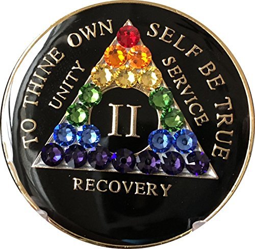 2 Year Black Tri-Plate AA Medallion With Rainbow Color Swarovski Crystals Installed By Persons In Recovery. Made By Recovery Mint. Serenity Prayer On Back. Glass Like Epoxy Dome For A Premium Look And Feel - Size is 1 5/16" or 34x3mm