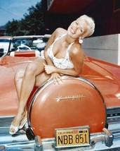 Jayne Mansfield in swimsuit poses on red Lincoln Continental 24x36 inch Poster