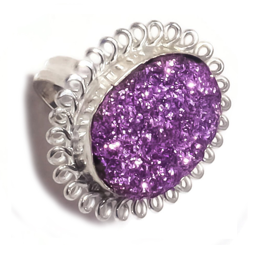 Pink Titanium Druzy Oval Gemstone 925 Silver Overlay Handmade Statement Ring US-8
