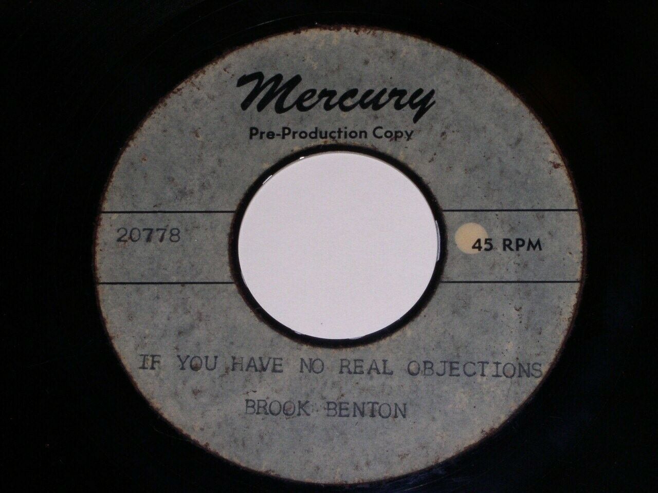 This is a very rare, vintage metal acetate 45 rpm phonograph record by Brook Benton, entitled, "Come Back My Love". Flipside: "If You Have No Real Objections". Record label: Mercury Pre-Production Copy.