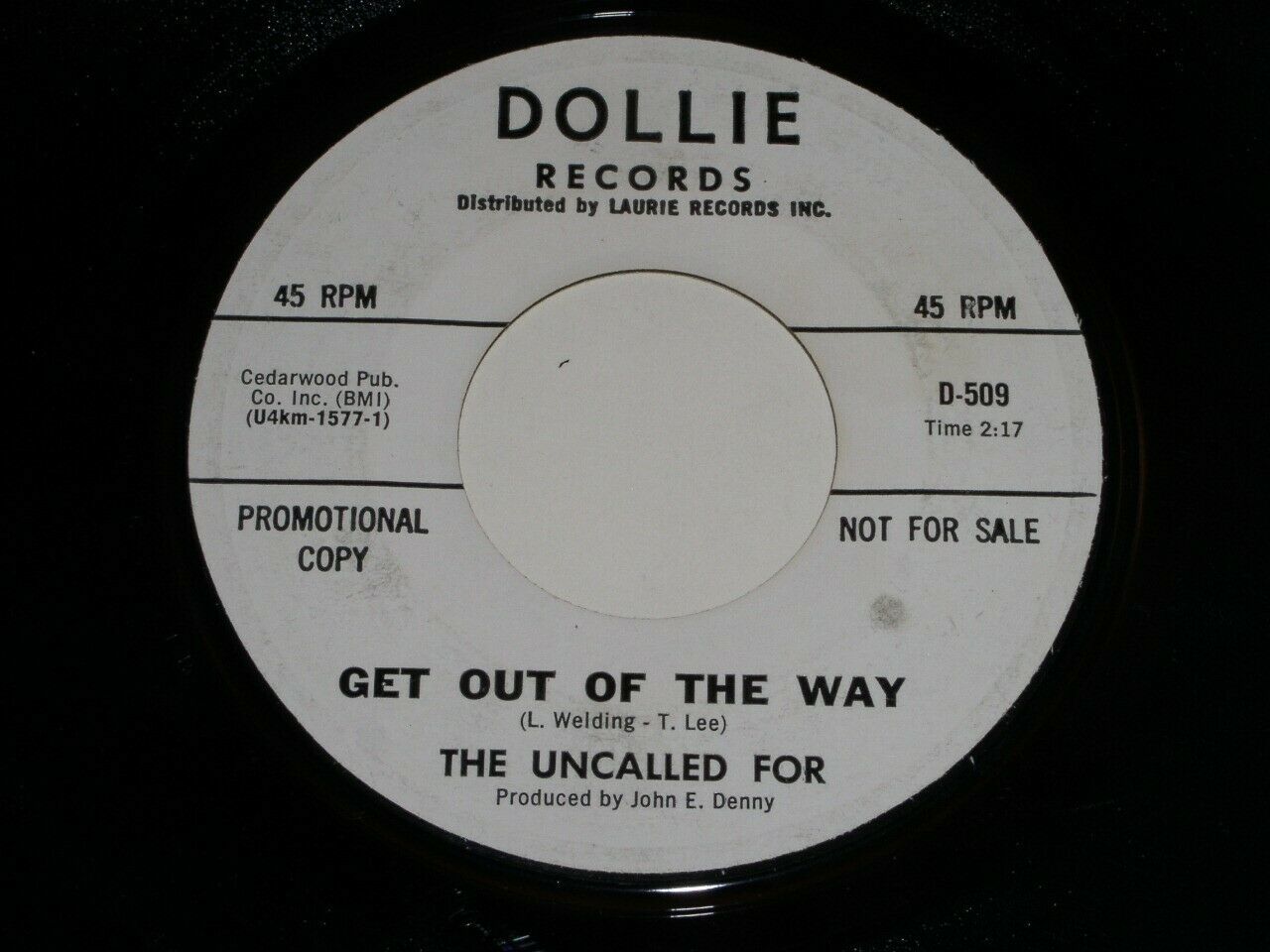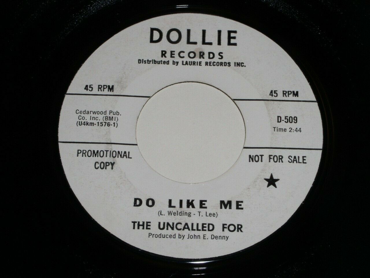 This is a vintage promotional 45 rpm phonograph record by The Uncalled For, entitled, "Do Like Me". Flipside: "Get Out Of The Way". Record label: Dollie 1577.