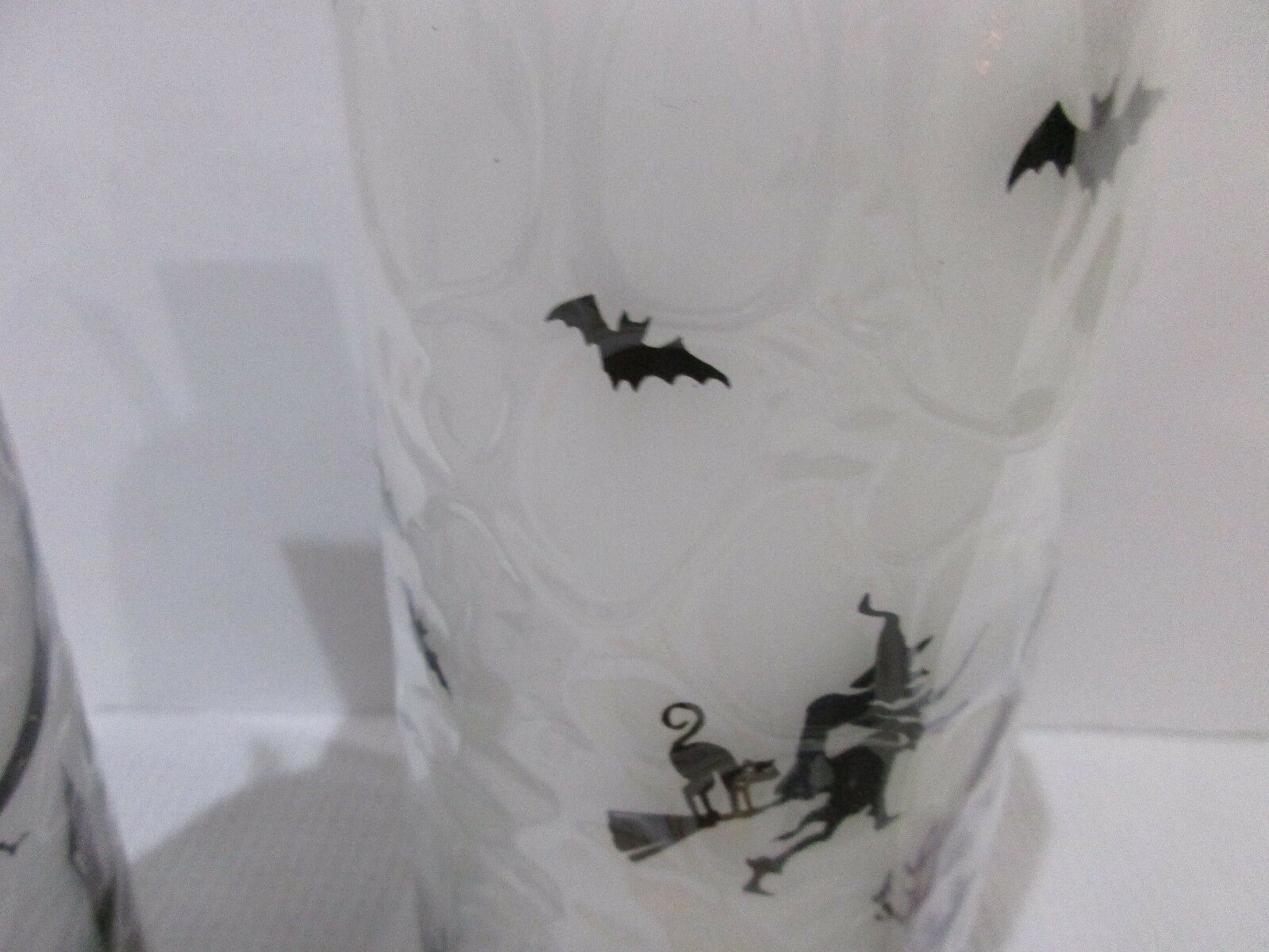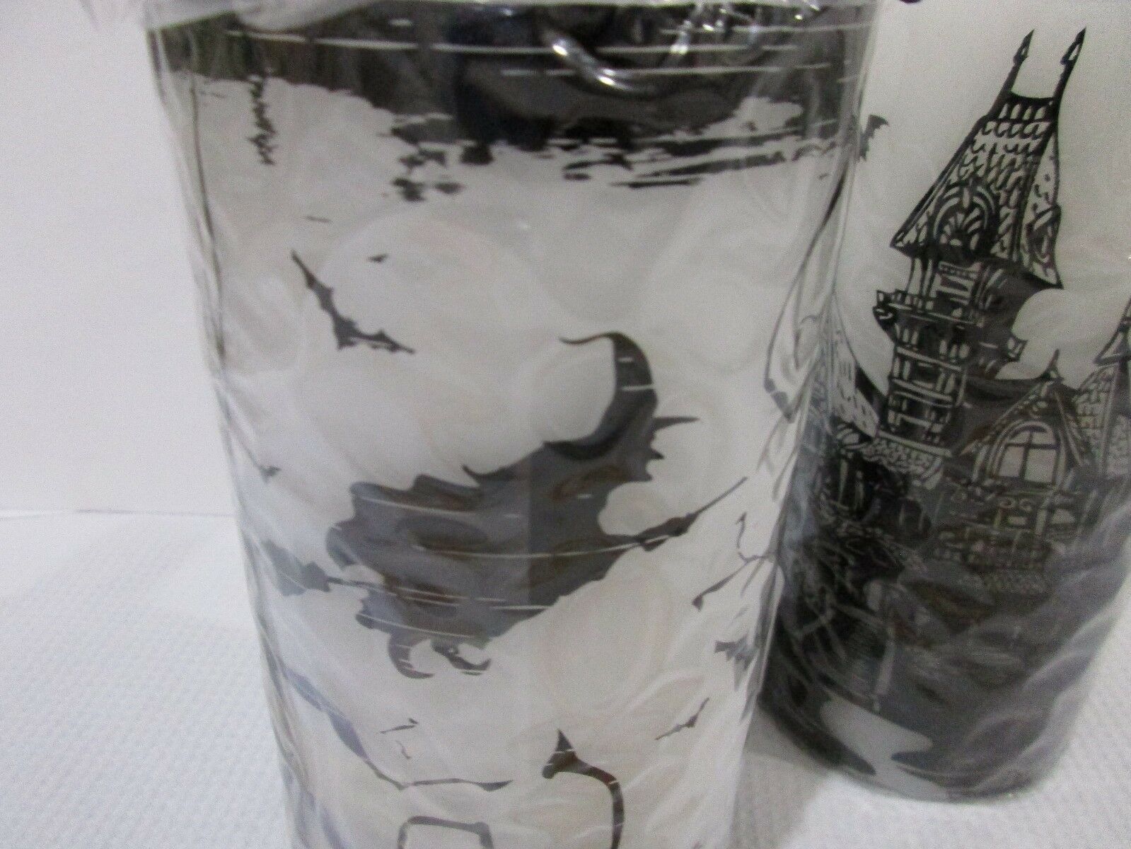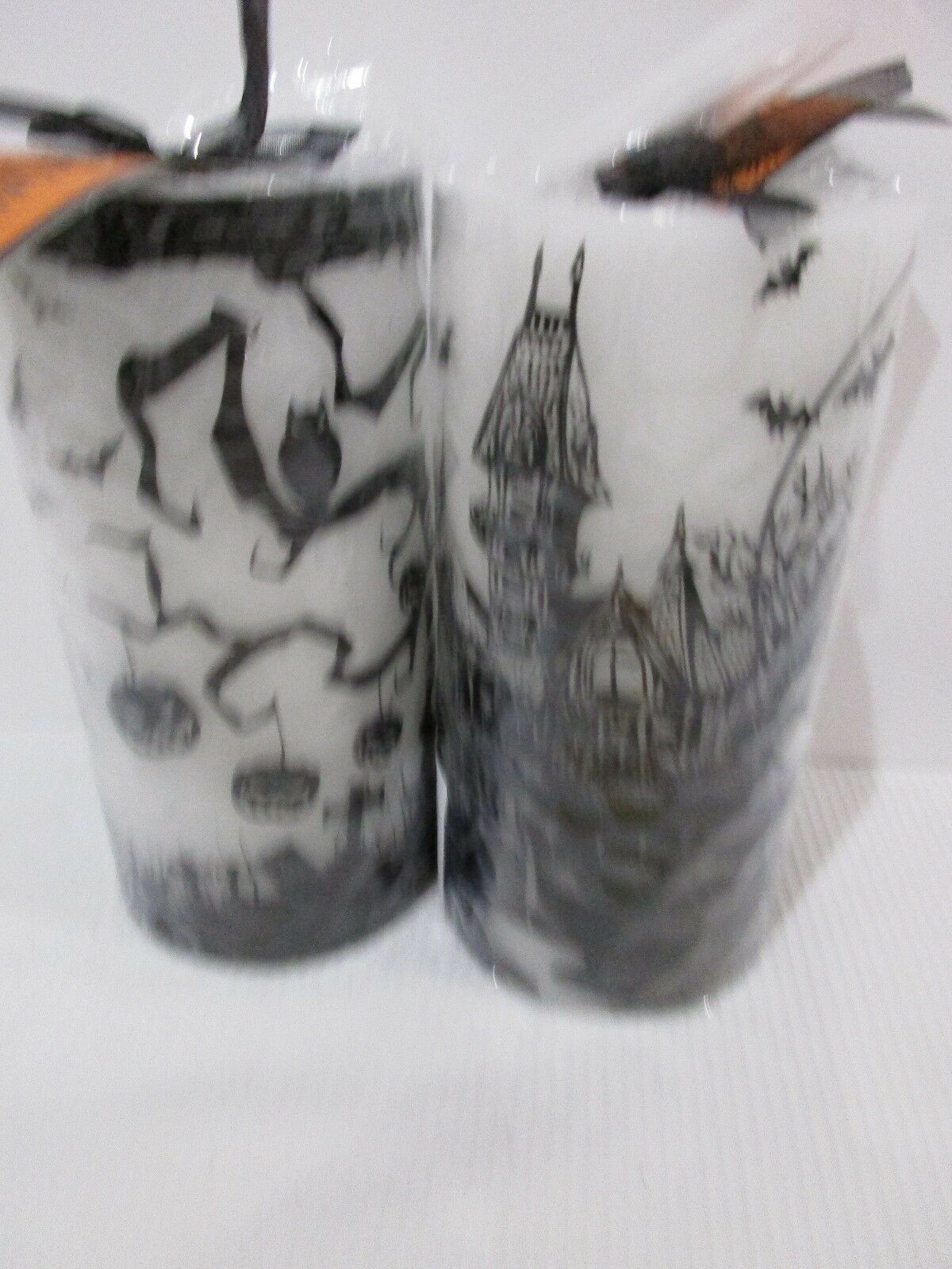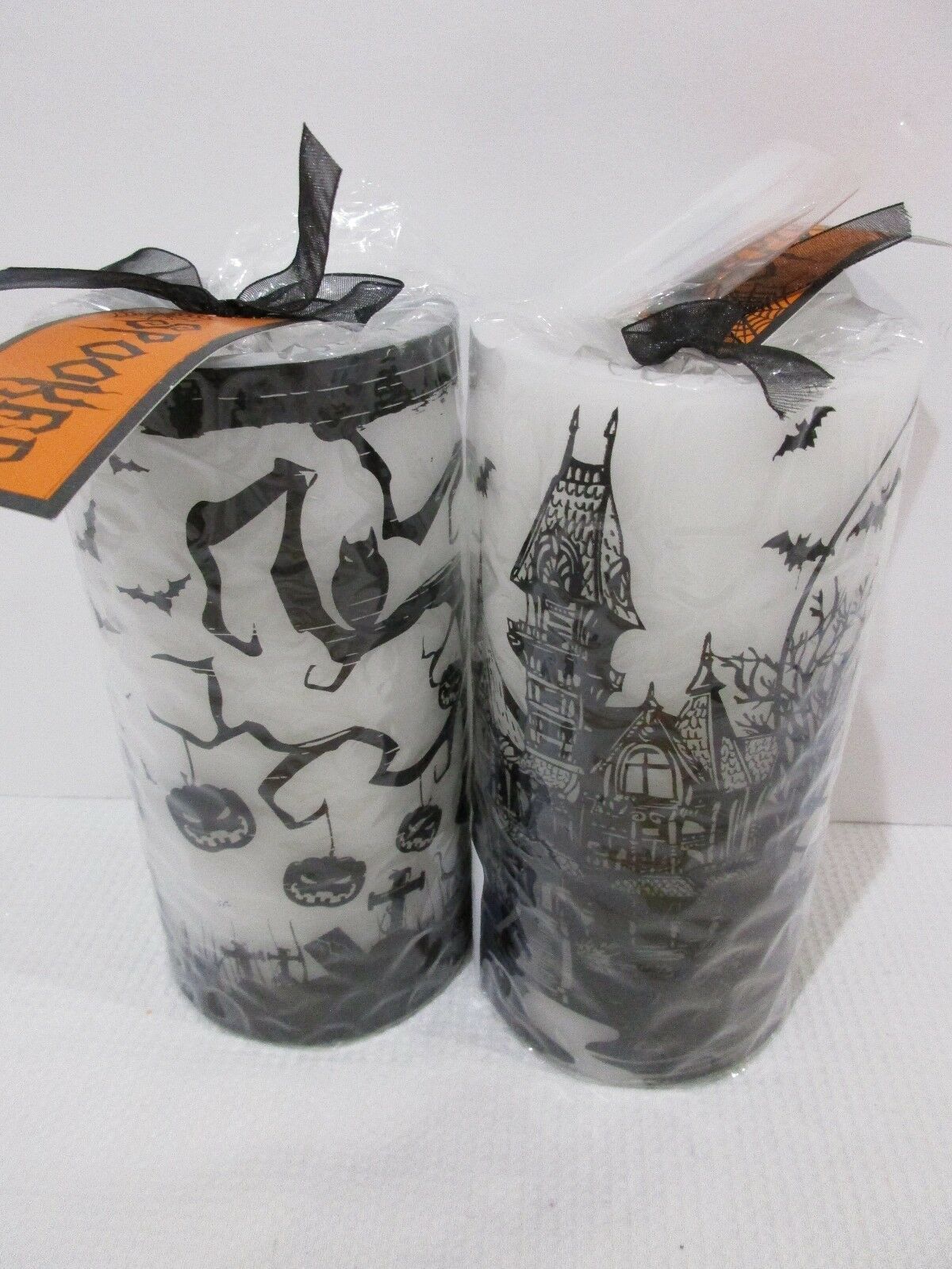 Up for sale are these 2 adorable flameless candles (batteries not included) requires 3 AAA batteries. These will be great for your spooky decor. They both have a spooky them like a Haunted House and creepy pumpkins and bats flying around. These measure approx 6" tall. NEW