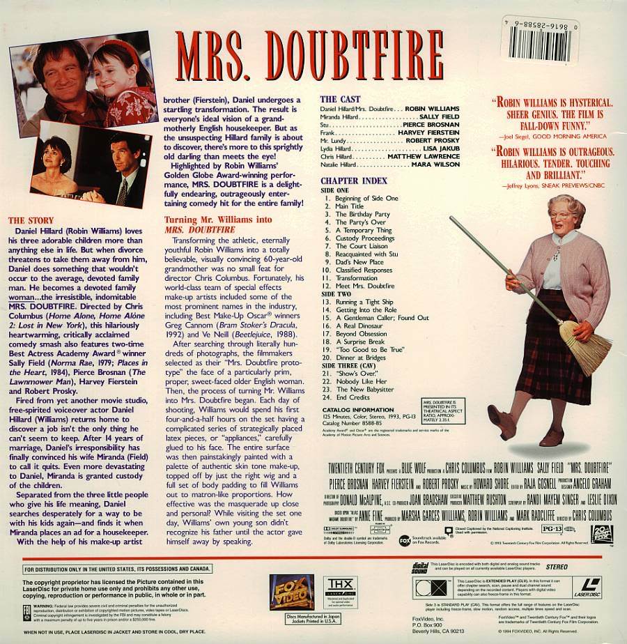 MRS. DOUBTFIRE SALLY FIELD LASERDISC RARE