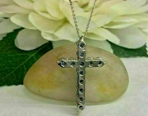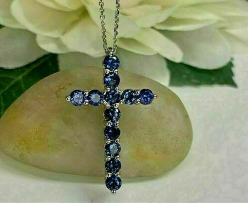 2.50Ct Coupe Ronde Saphir Bleu Pendentif Croix 14K or Blanc Finition 18 " Chaîne
