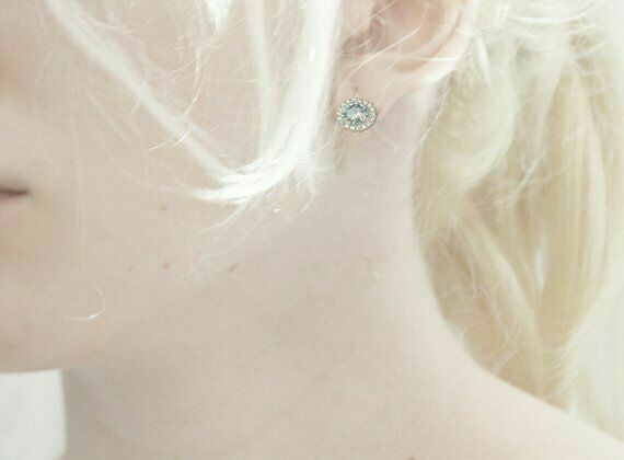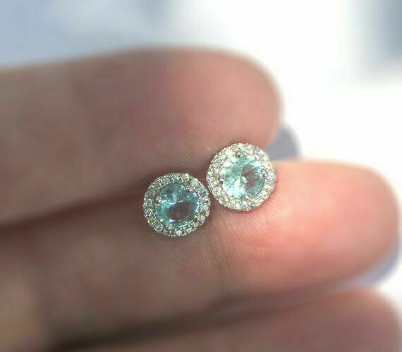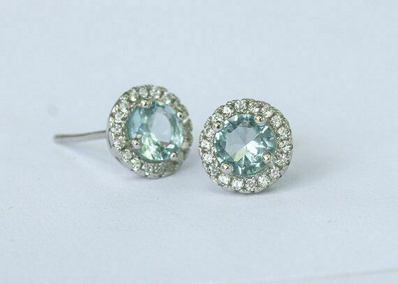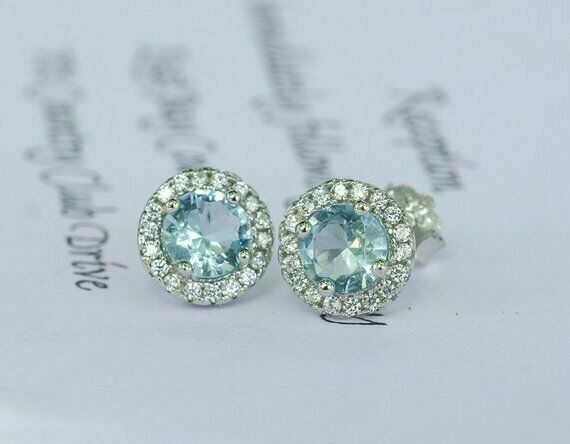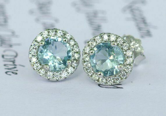 2Ct Brillante Redondo Corte Aguamarina Halo Tuerca Pendientes En 14K Oro Blanco