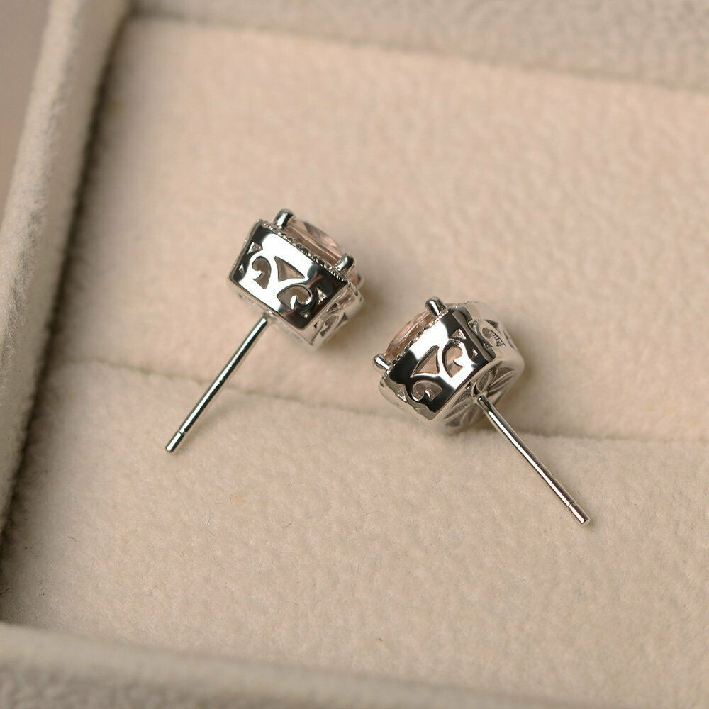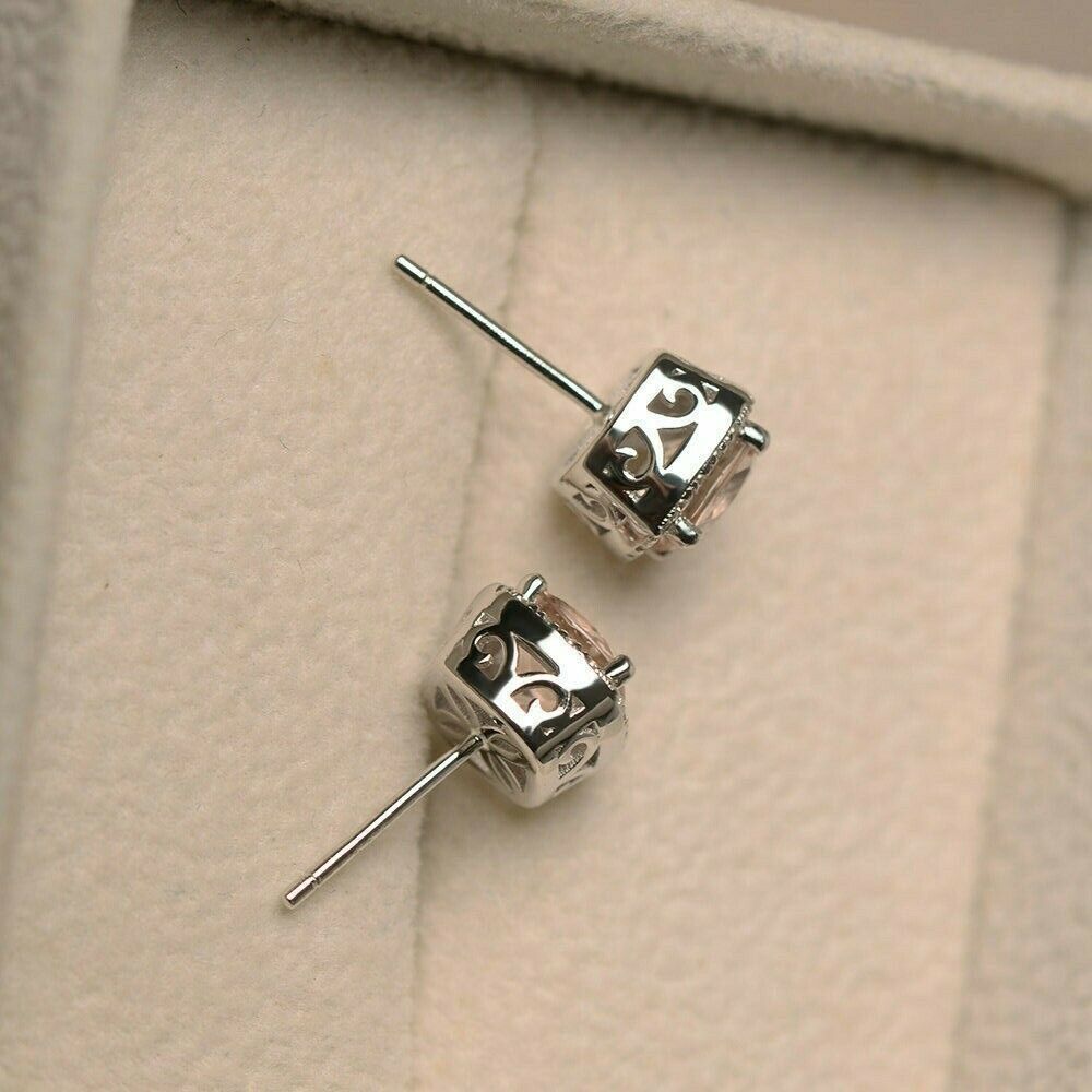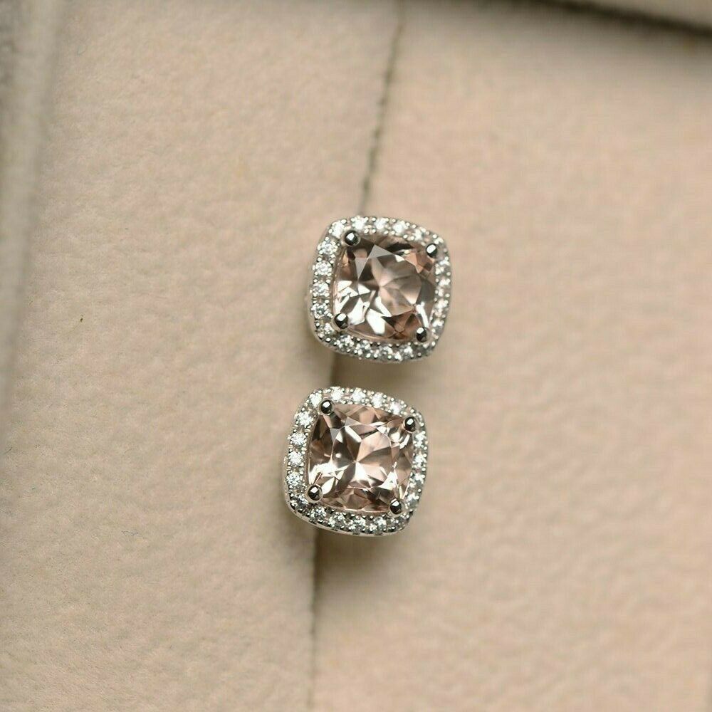 2.25Ct Coussin Brillant Coupe Morganite Halo Clou Boucles 14K or Blanc Finition