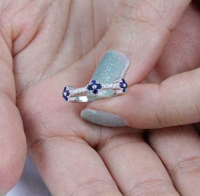 1.20Ct Taglio Rotondo Zaffiro Blu Fede Nuziale Mezza Eternity 14k Oro Bianco