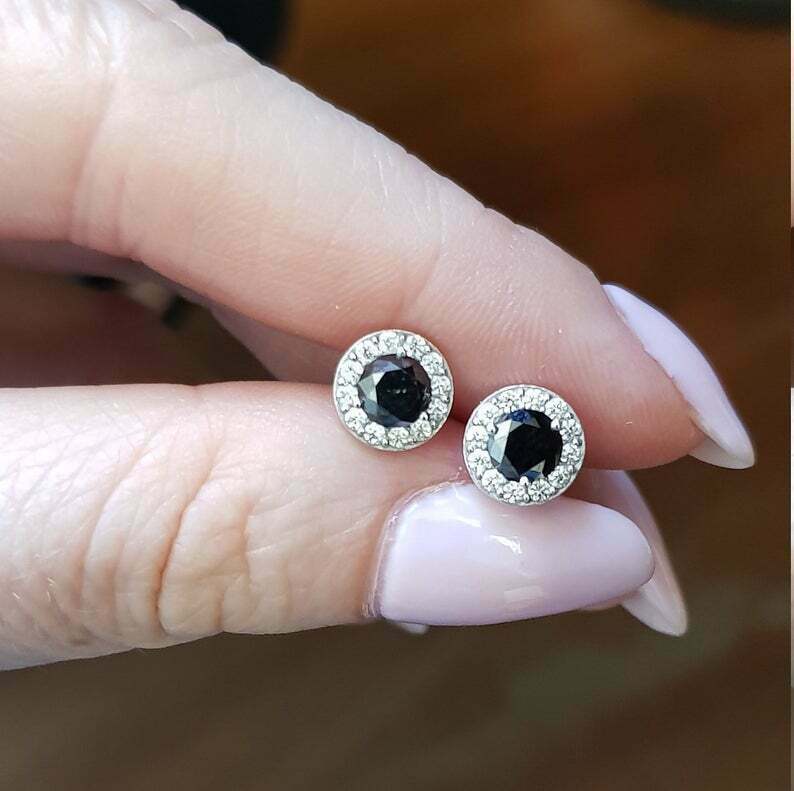 2Ct Excelente Corte Redondo Negro Diamante Halo Dormilonas 14K Oro Blanco Finish
