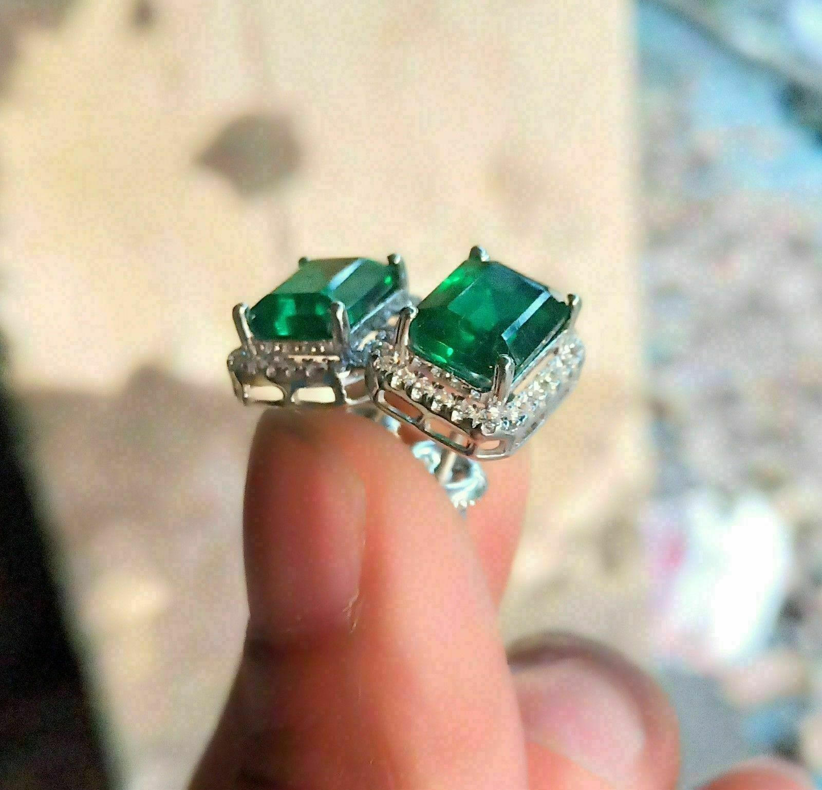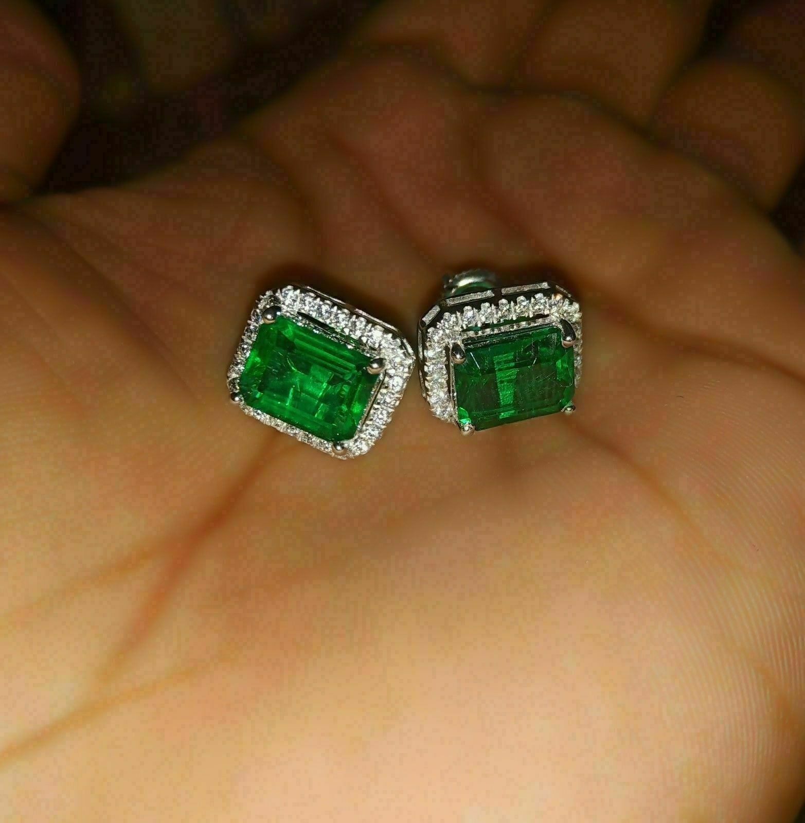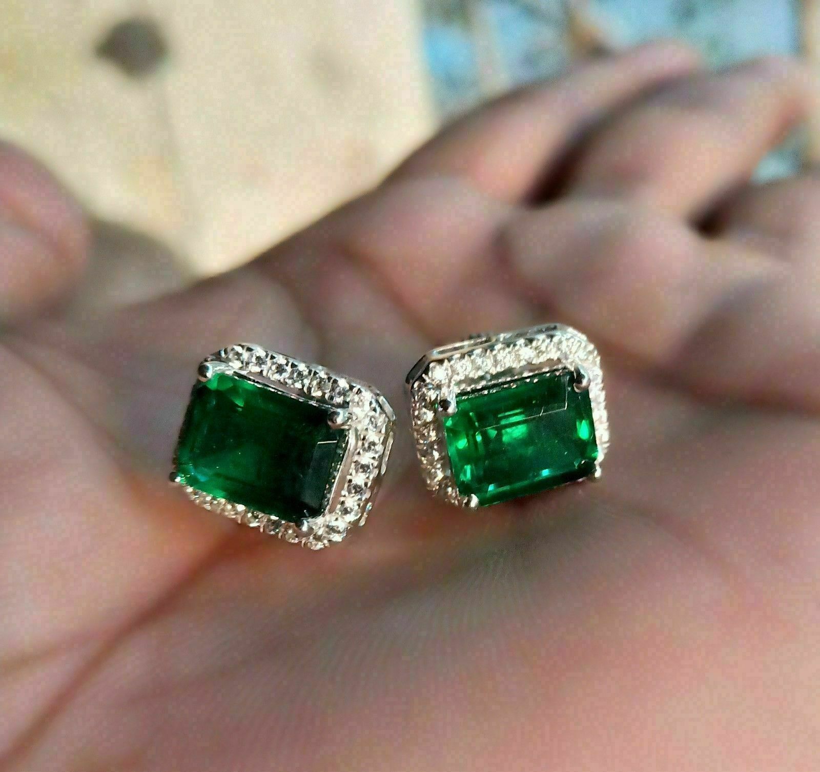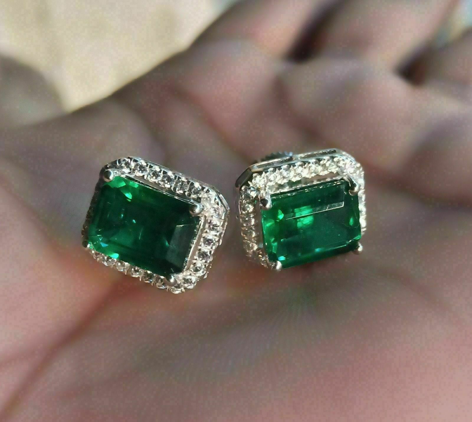 4Ct Smaragd Schliff Grün Smaragd Heiligenschein Ohrstecker 14K Weißgold Finish