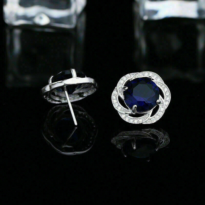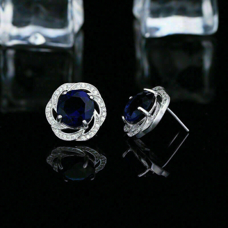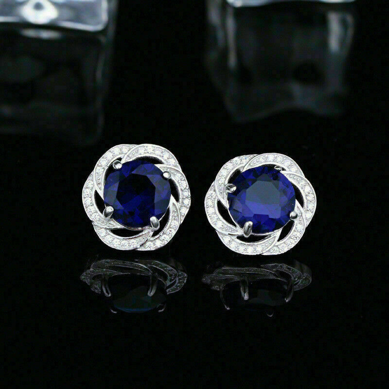 Precioso 2.50Ct Corte Redondo Zafiro Azul Halo Dormilonas 14K Oro Blanco Acabado