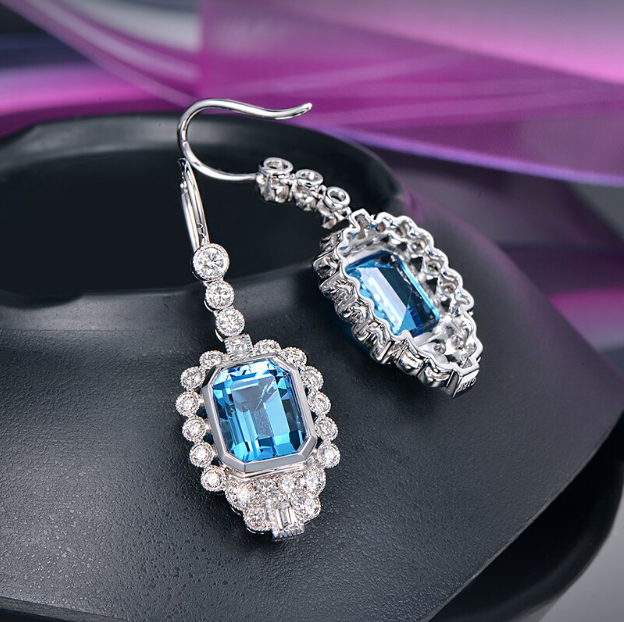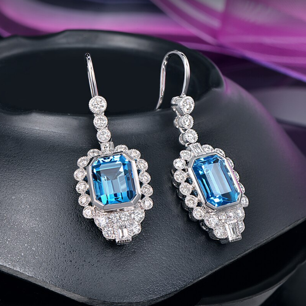 4.20Ct Corte Esmeralda Topacio Azul Gota Colgante Dormilonas 14K Oro Blanco