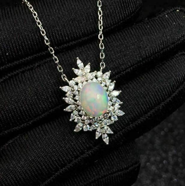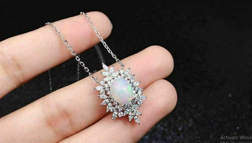 2Ct Corte Ovalado Fuego Ópalo y Diamante Halo Colgante 14K Oro Blanco Acabado De