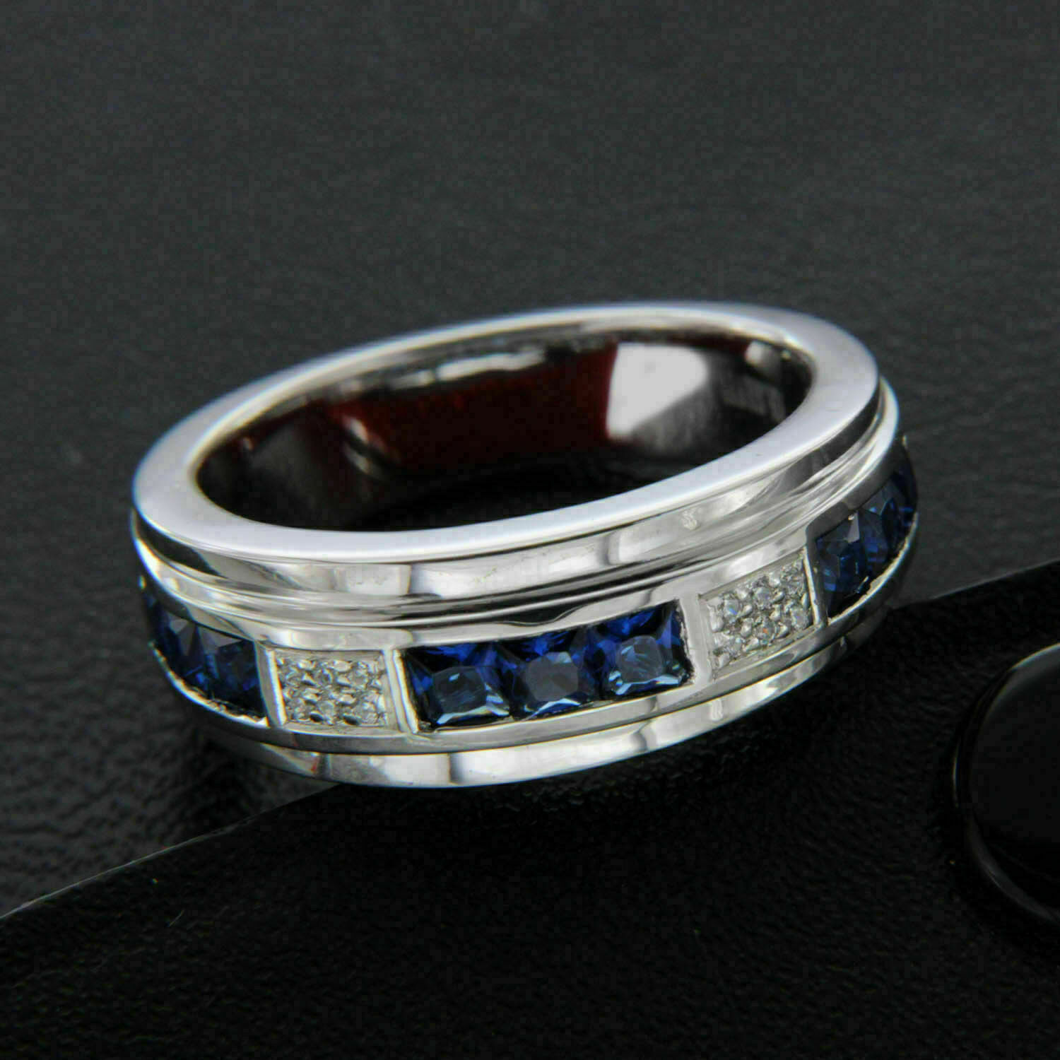 3Ct Taglio Princess Zaffiro Blu Diamante Carino Fede Nuziale 14K Oro Bianco