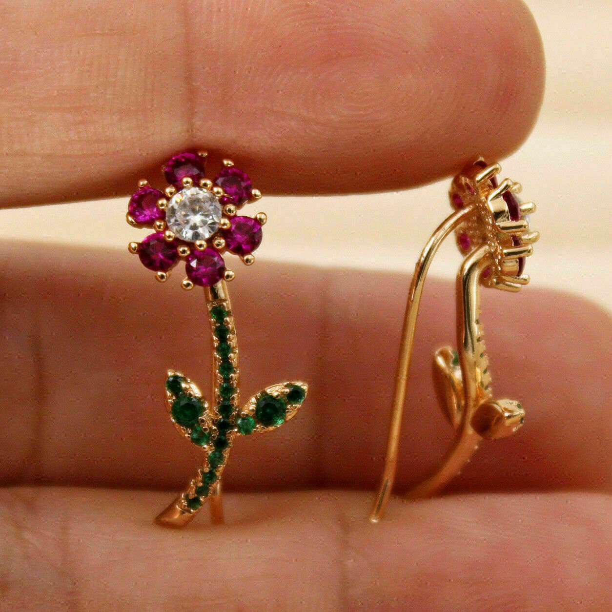 2Ct Rund Schliff Rot Ruby green Smaragd Blume Ohrstecker 14K Gelbgold Finish