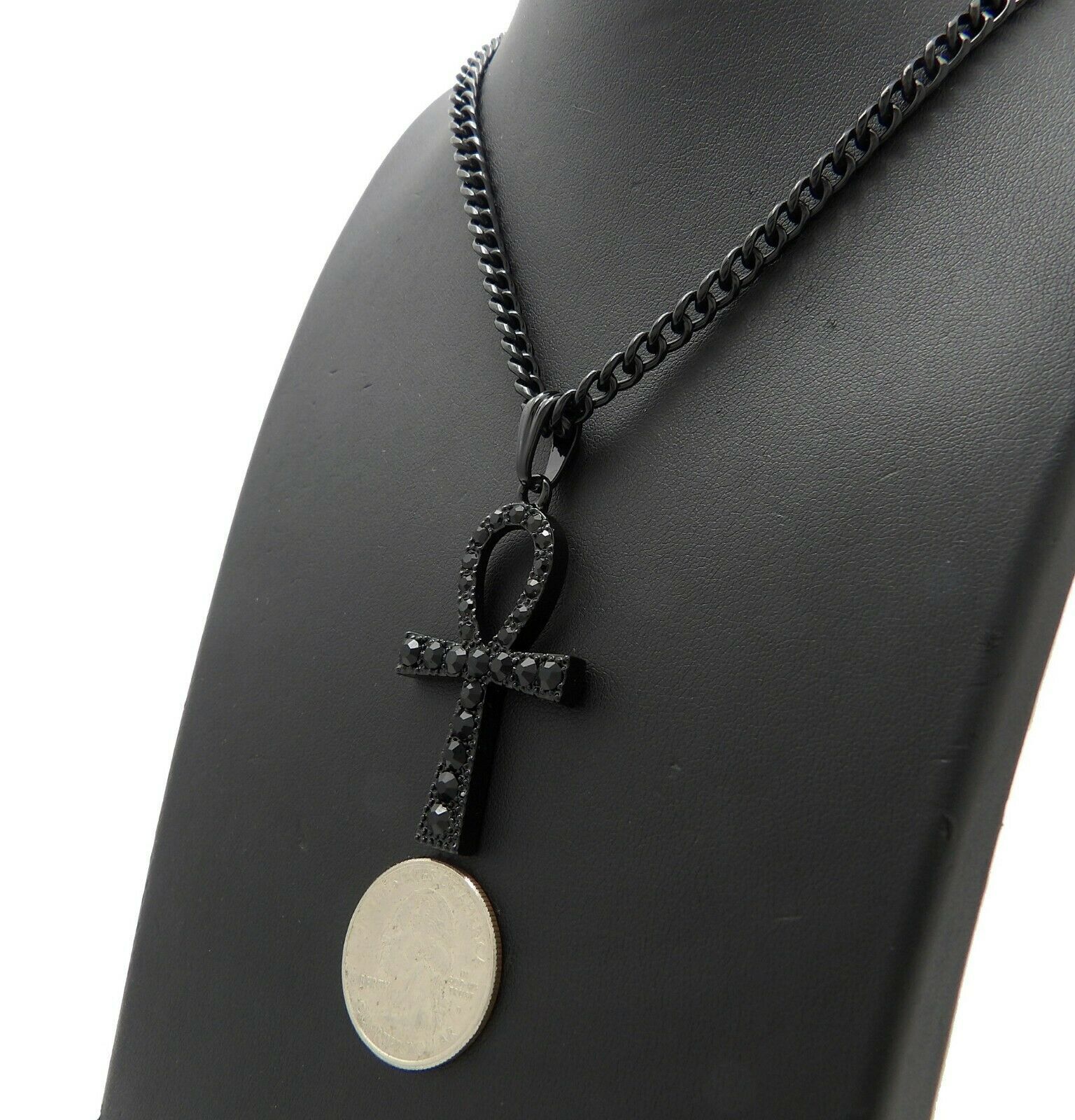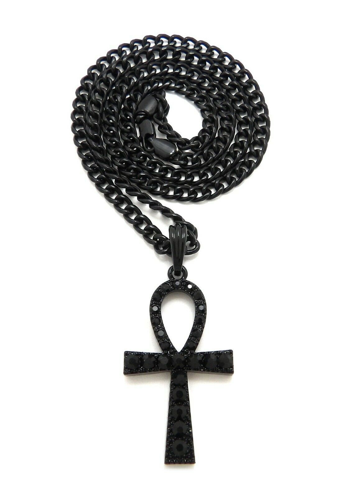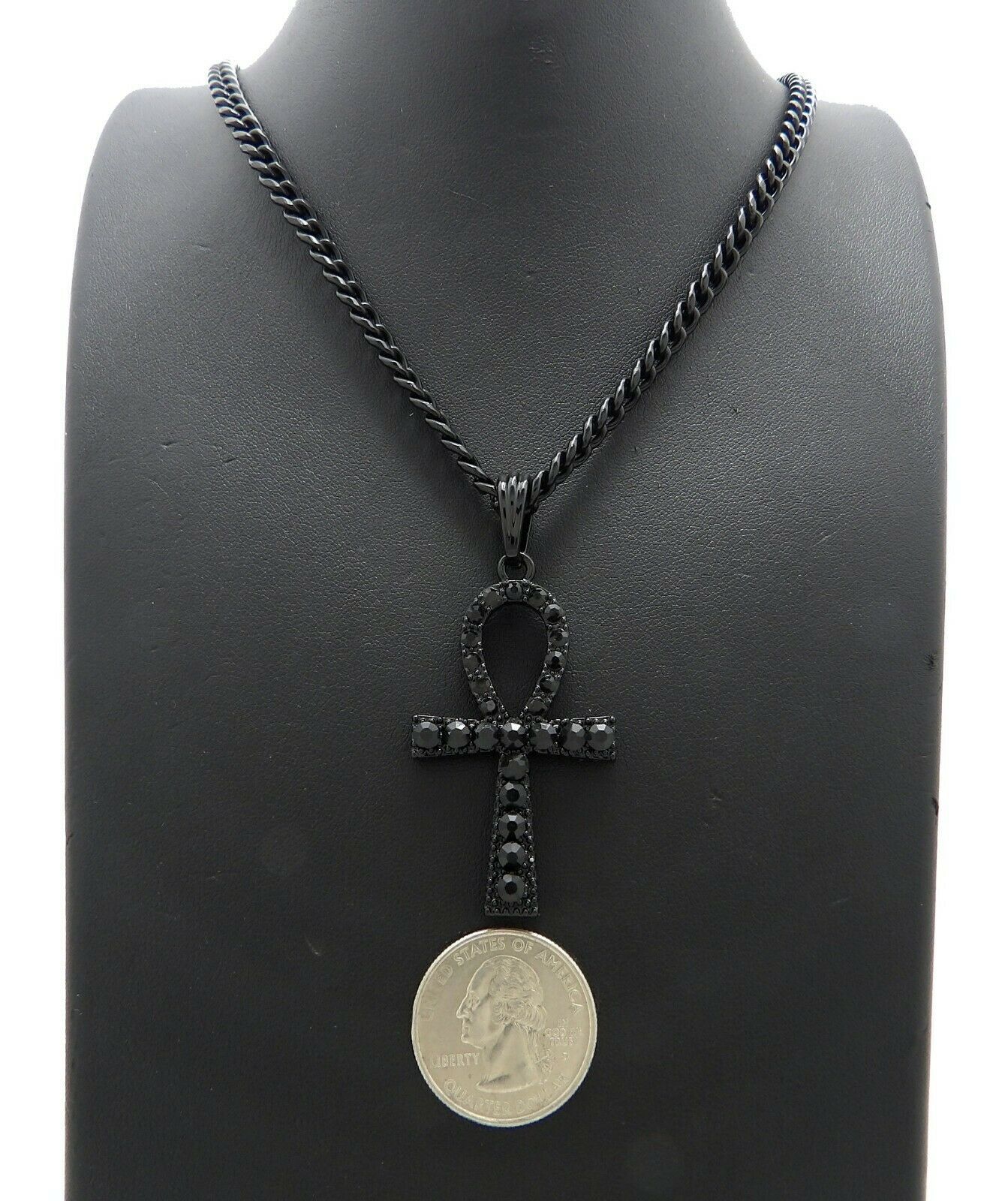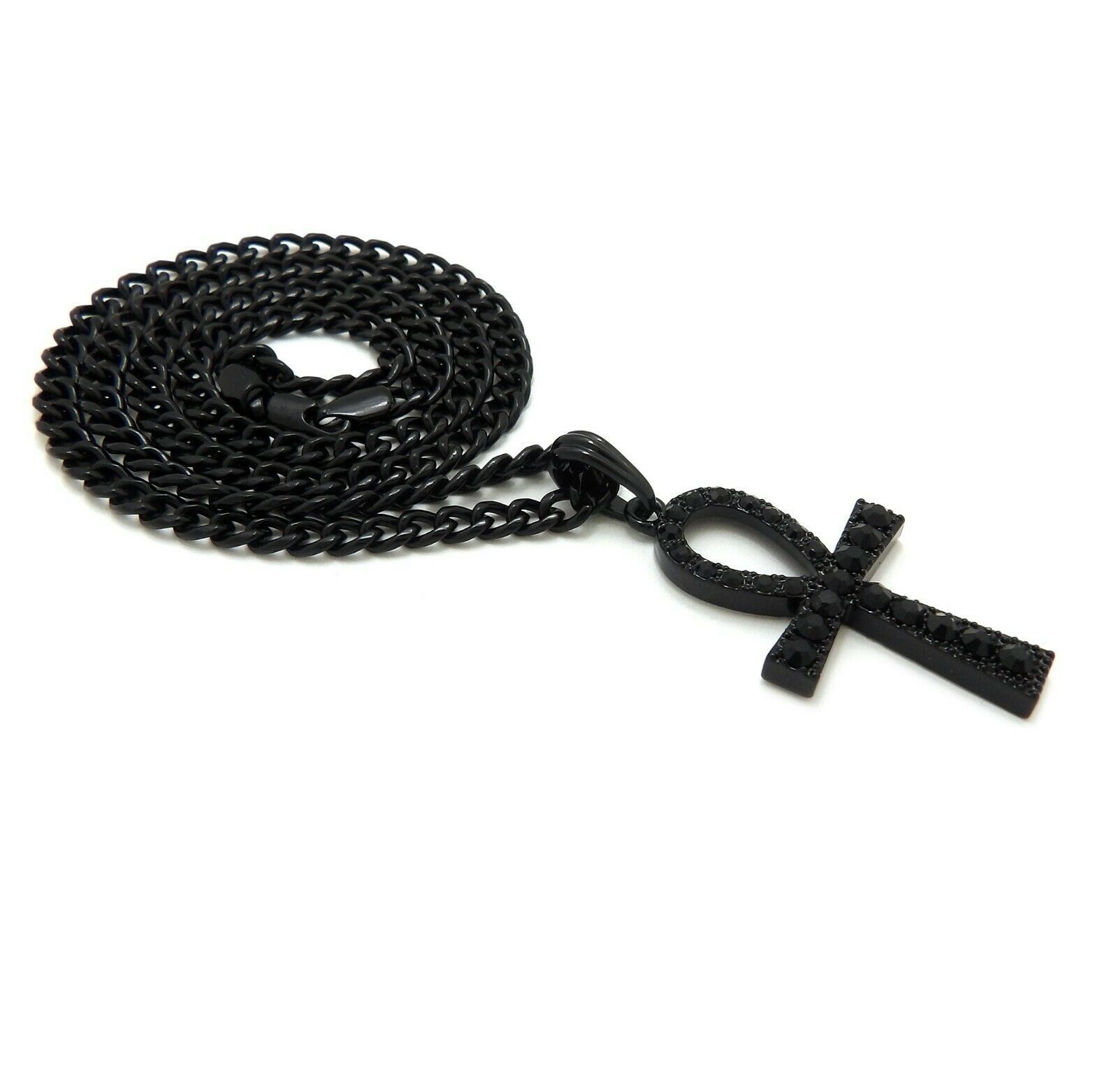 Ancient Egyptian Coptic ANKH Cross with Black Tone Crystals Cuban Chain Necklace