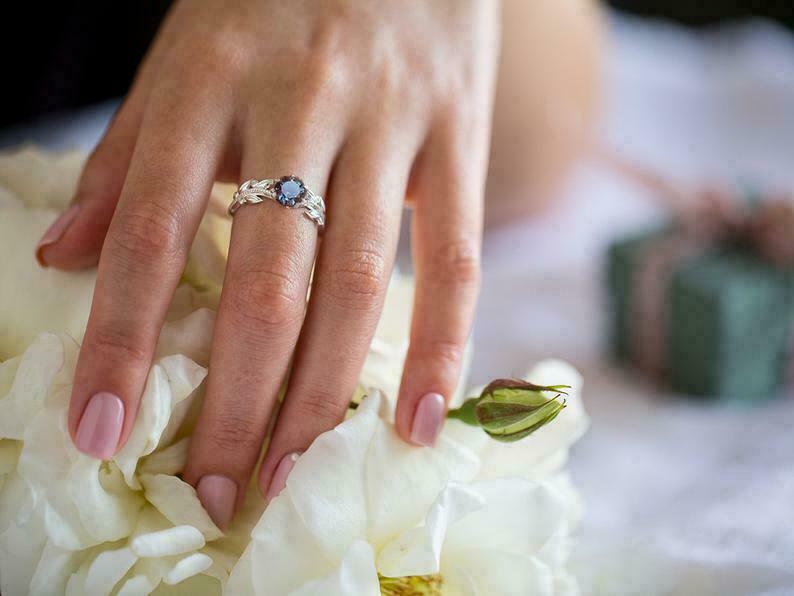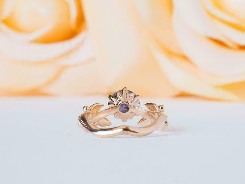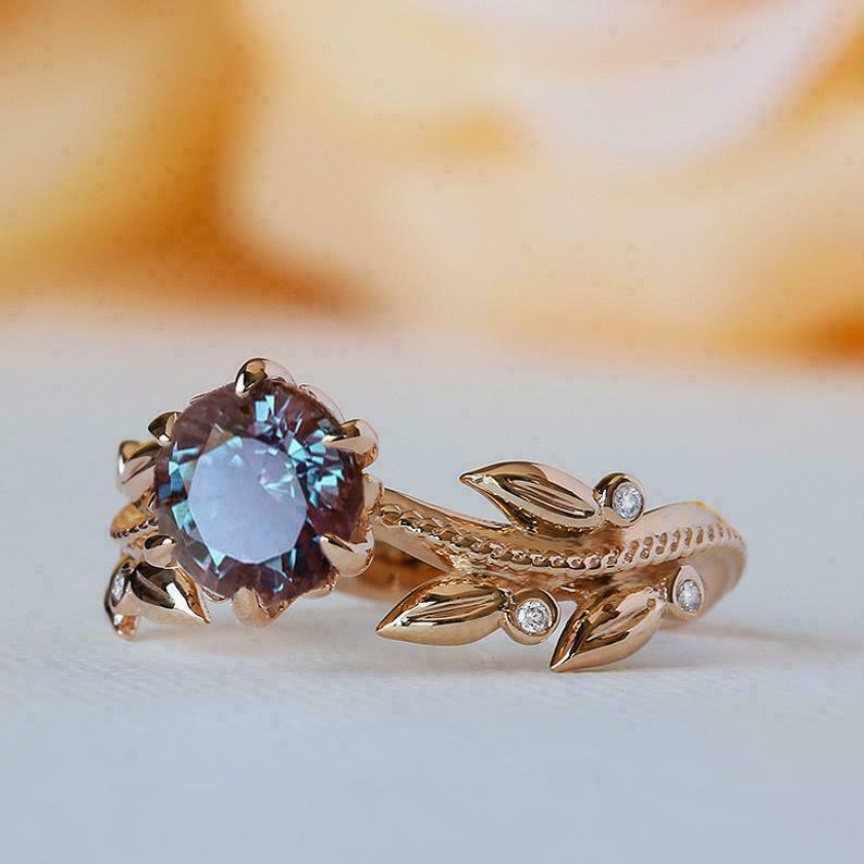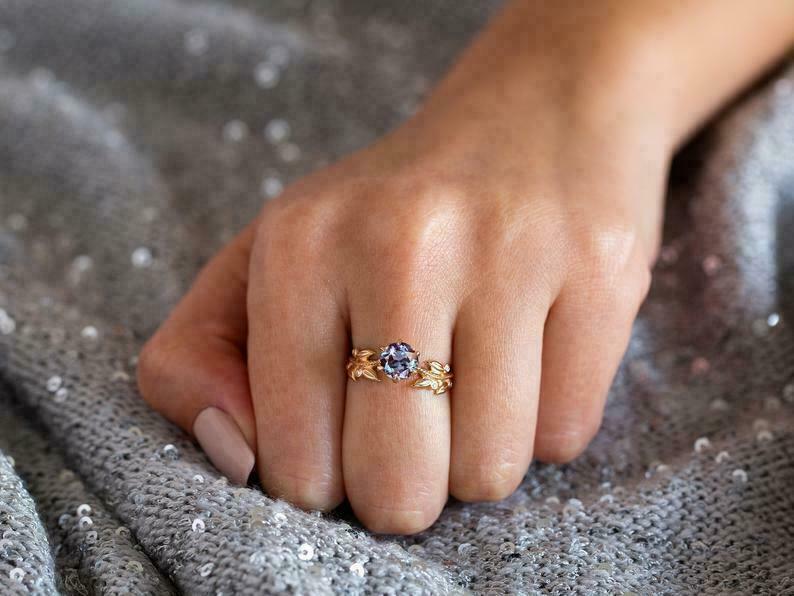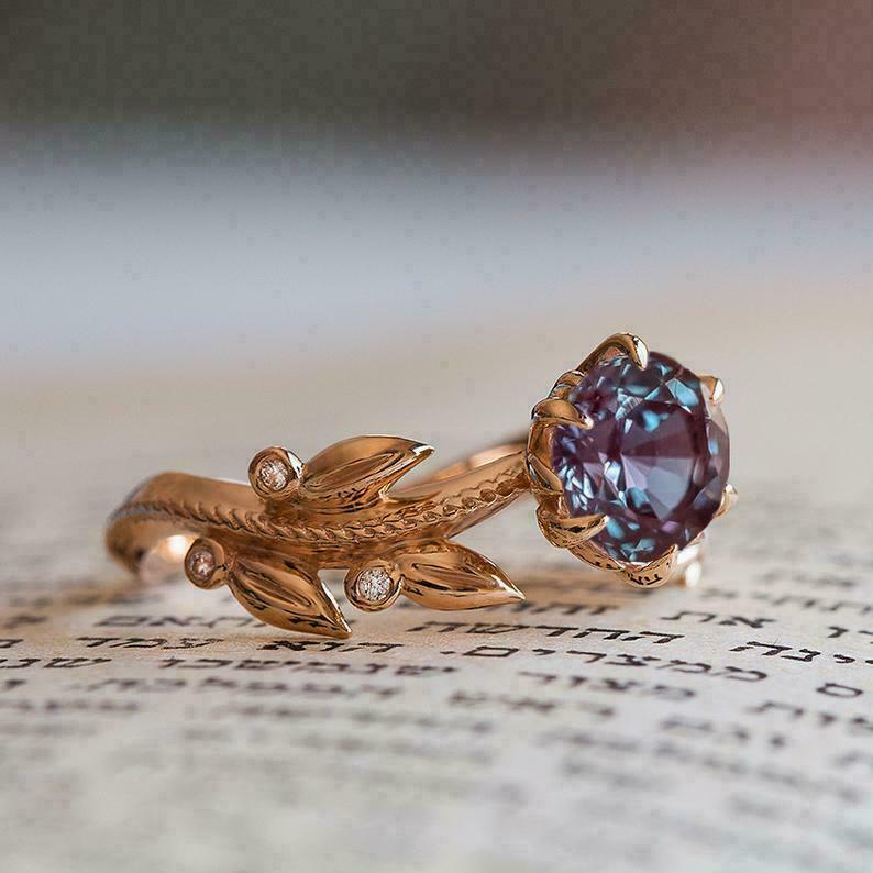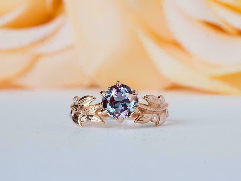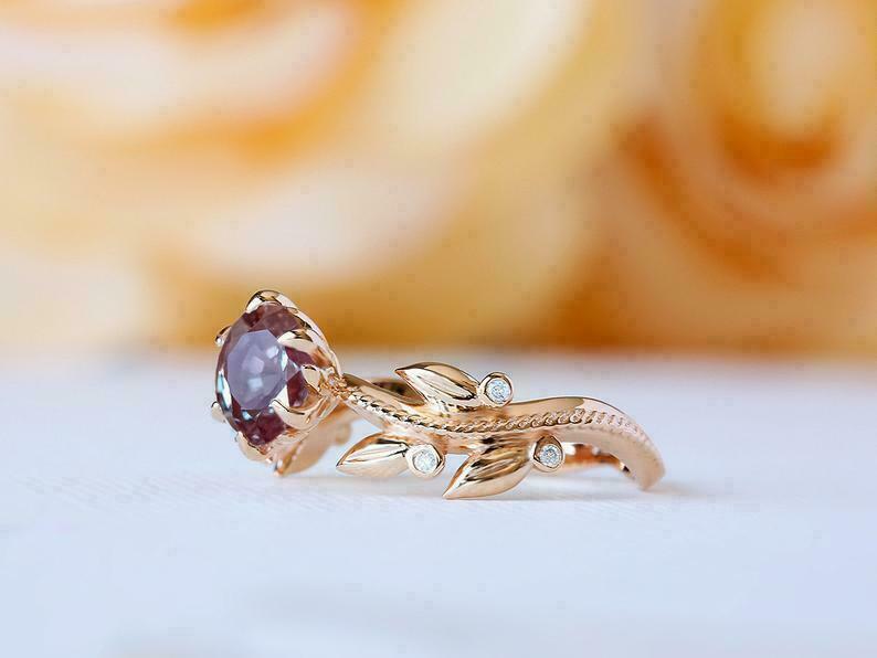 2Ct Corte Redondo Alejandrita Hoja Detalle Mujer Compromiso Ring 14k Oro Rosa En
