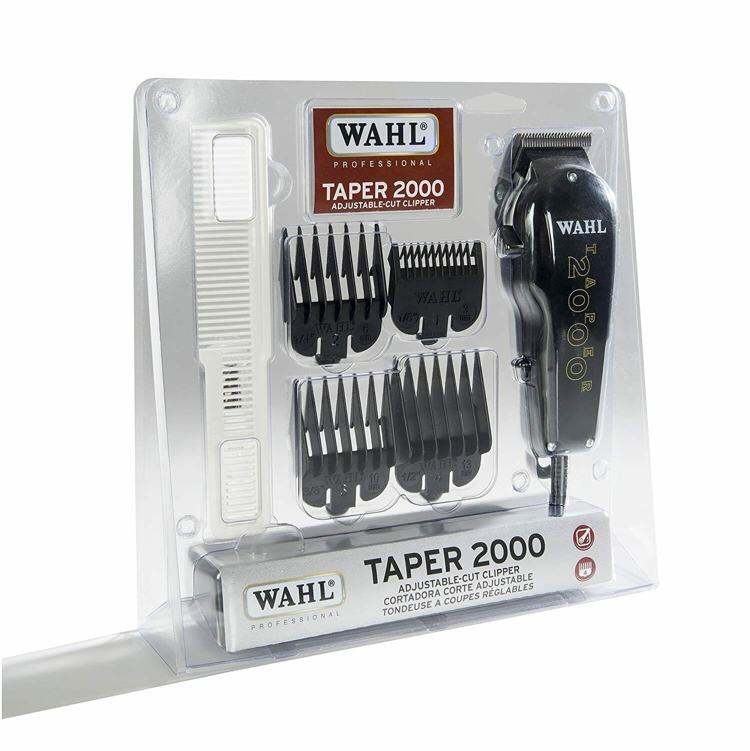 For your convenience, the Taper 2000 Adjustable Cut Clipper comes with 4 attachment combs, oil, cleaning brush, styling comb, instructions, red blade guard, and instructions