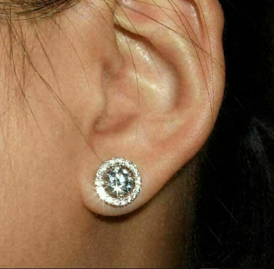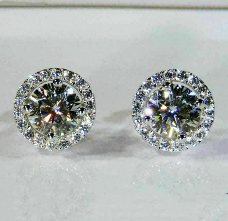 4Ct Corte Redondo Moissanita a Presión Halo Dormilonas 14K Acabado en Oro Blanco