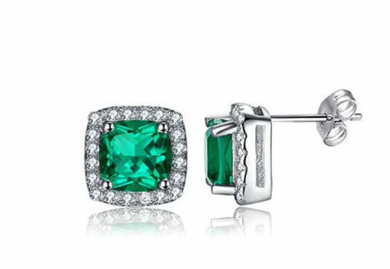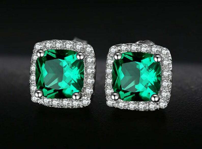 4.20Ct Kissen Schnitt Grün Smaragd Halo Ohrstecker 14K Weißgold Finish