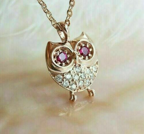 0.50CT Coupe Ronde Rubis Diamant Pendentif Chouette Adorable 14k or Jaune Sur