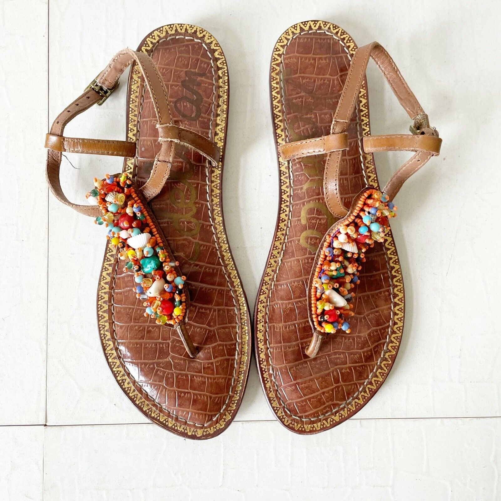 Sam Edelman Gabrielle Leather Beaded Embellished T-Strap Thong Sandal Shoe 7