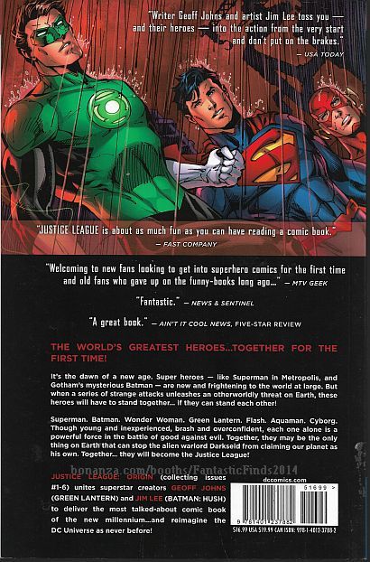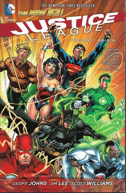 Description: Original cover price: $16.99. Written by Geoff Johns. Art and cover by Jim Lee and Scott Williams. Collects Justice League (2011) #1-6. Comics superstars Geoff Johns and Jim Lee make history with the first softbound collection of a DC COMICS - THE NEW 52 series! In a universe where Super Heroes are strange and new, Batman has discovered a dark evil that requires him to unite the World Greatest Heroes! Superman, Batman, Wonder Woman, Green Lantern, Aquaman, The Flash and Cyborg unite for the first time to form the JUSTICE LEAGUE! Softcover, 176 pages, full color. 082221-082221P