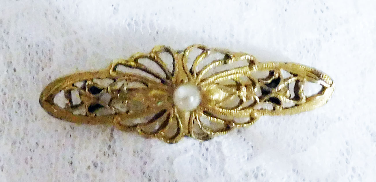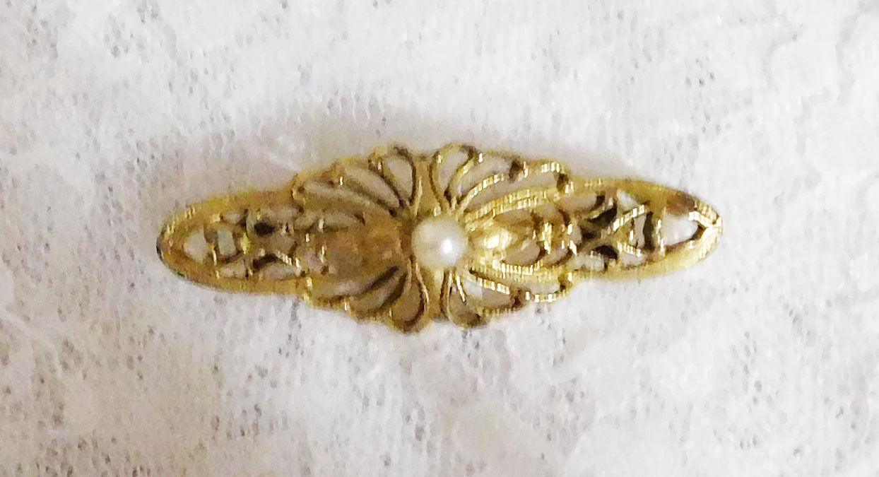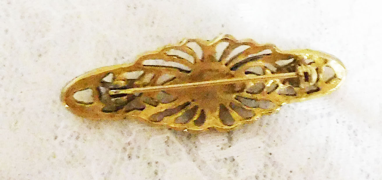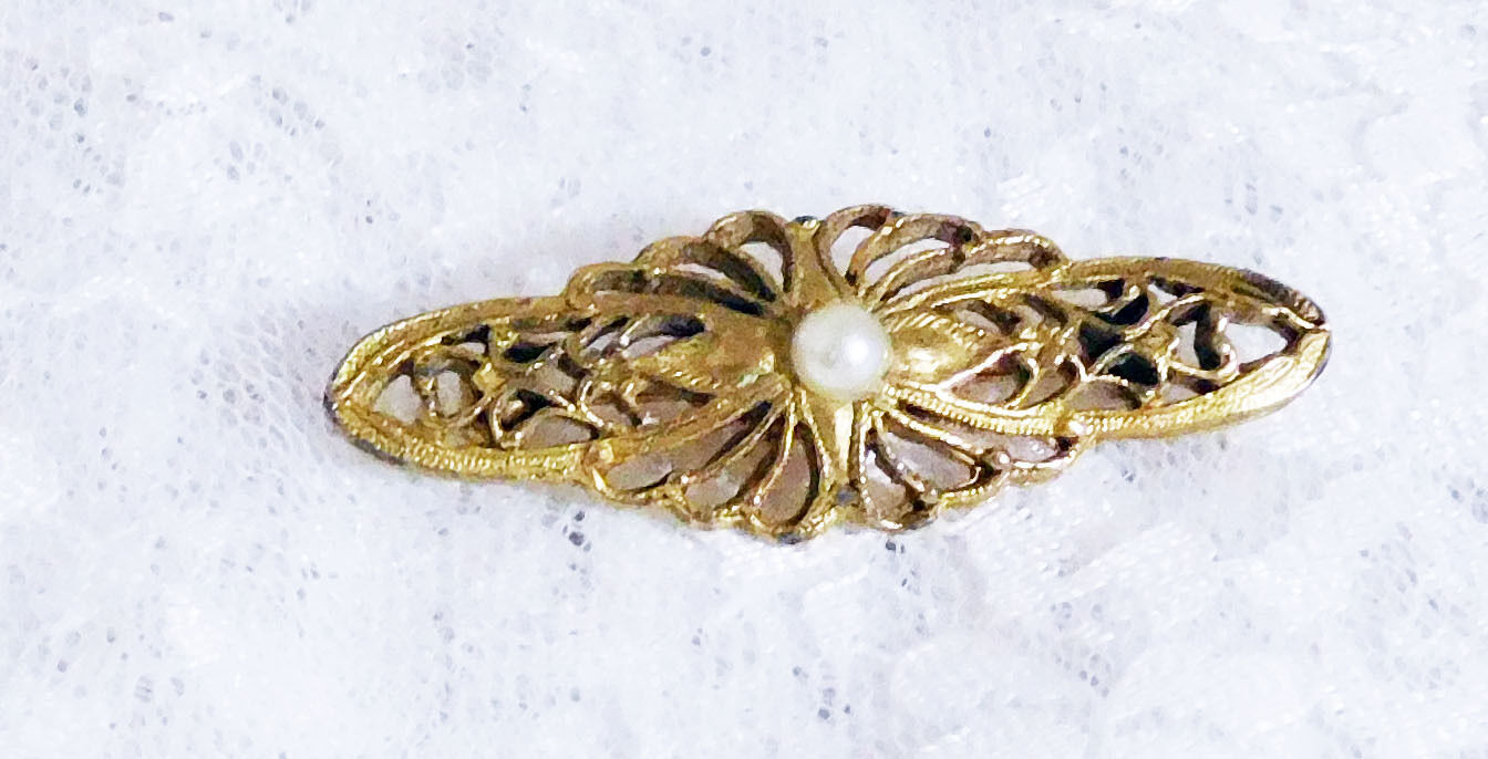 Vintage Brooch Gold Colored with Faux Pearl Center 2 1/8" Long Very Pretty