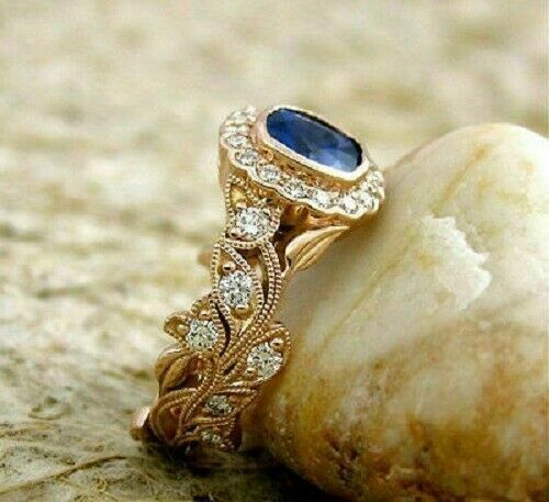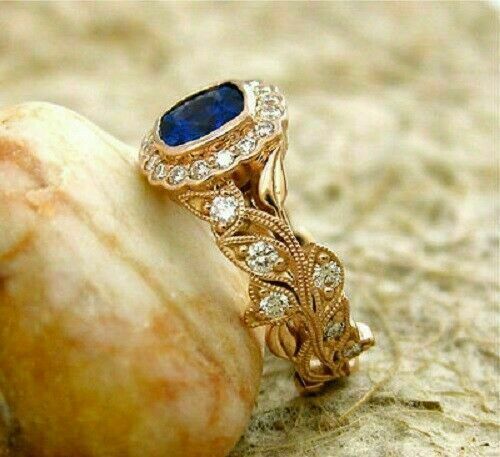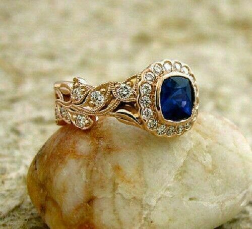 2Ct Kissen Schnitt Blauer Saphir Damen Halo Verlobungsring 14K Gelbgold Über