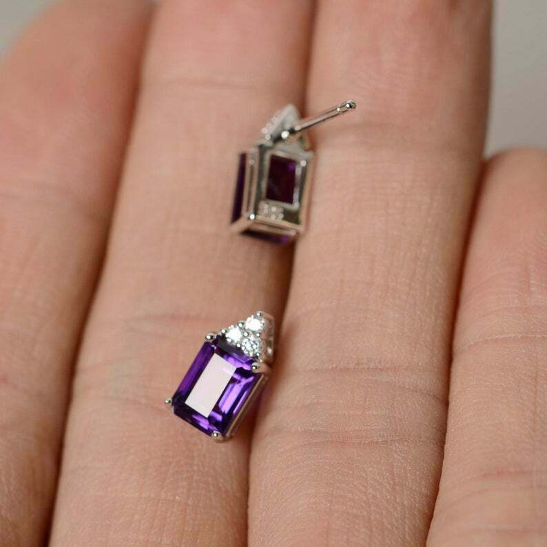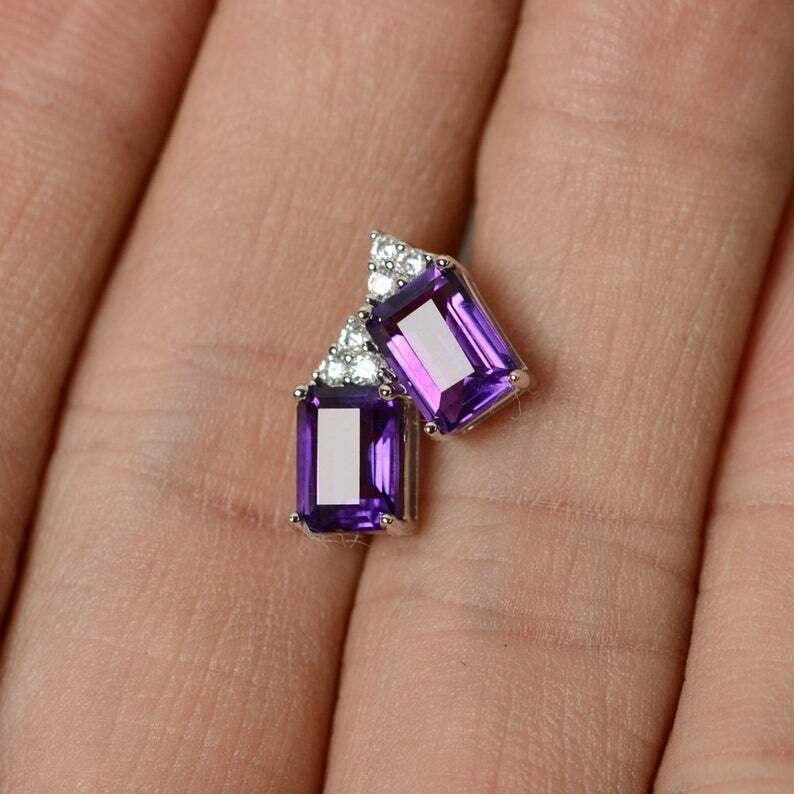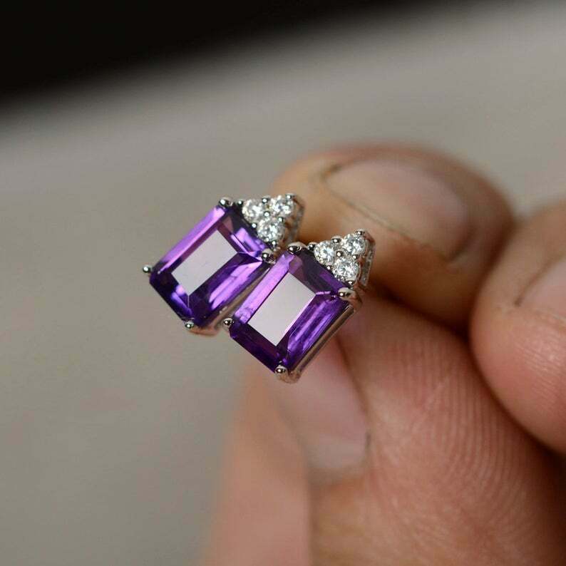 4Ct Émeraude Coupe Améthyste Solitaire Boucles D'Oreilles 14K or Blanc Finition