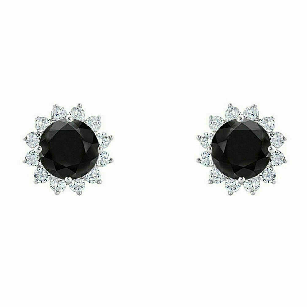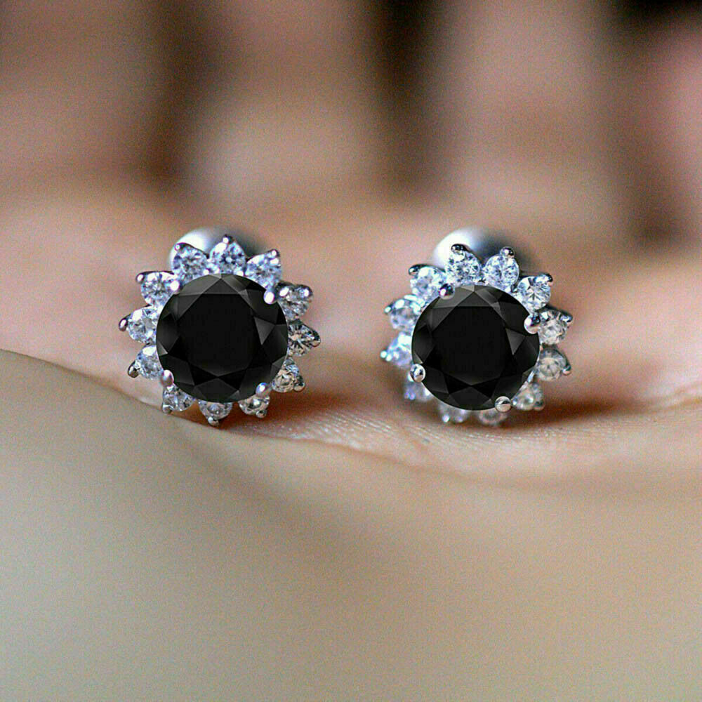 2Ct Corte Redondo Negro VVS1 Diamante Flor Dormilonas 14k Acabado en Oro Blanco