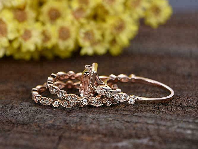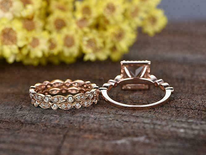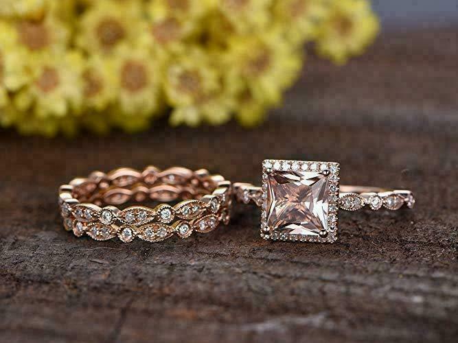3CT Taglio Princess Morganite Halo Fidanzamento Anello & Sposa Set 14K Oro Rosa