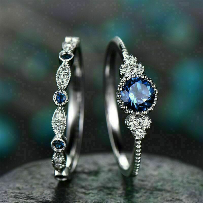 3Ct Taglio Rotondo Zaffiro Blu/Diamante Sposa Matrimonio Set Anello 14K Bianco