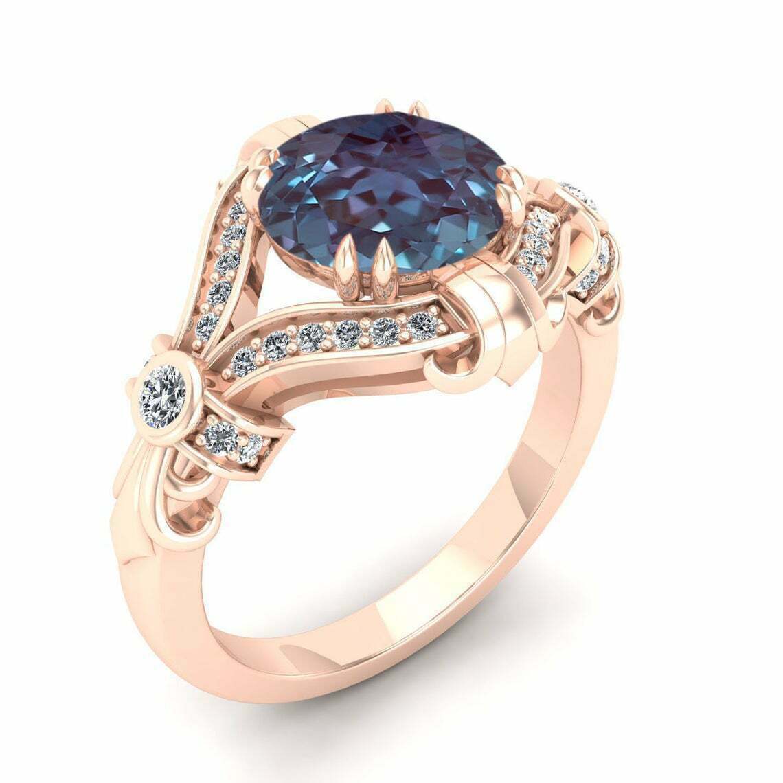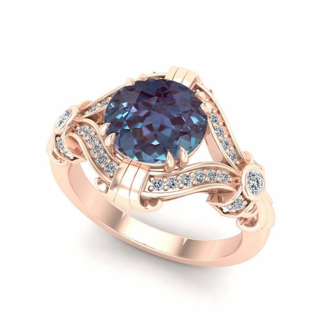 3.20Ct Taglio Rotondo Alexandrite Contorto Halo Fidanzamento Anello 14K Oro Rosa