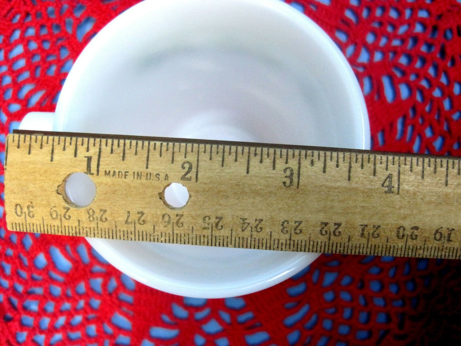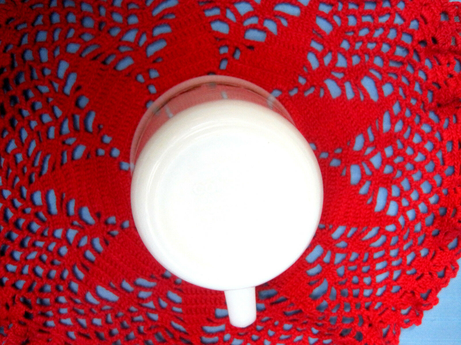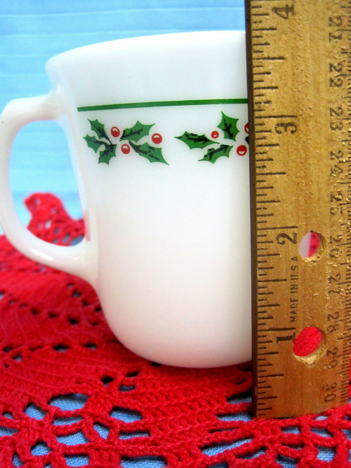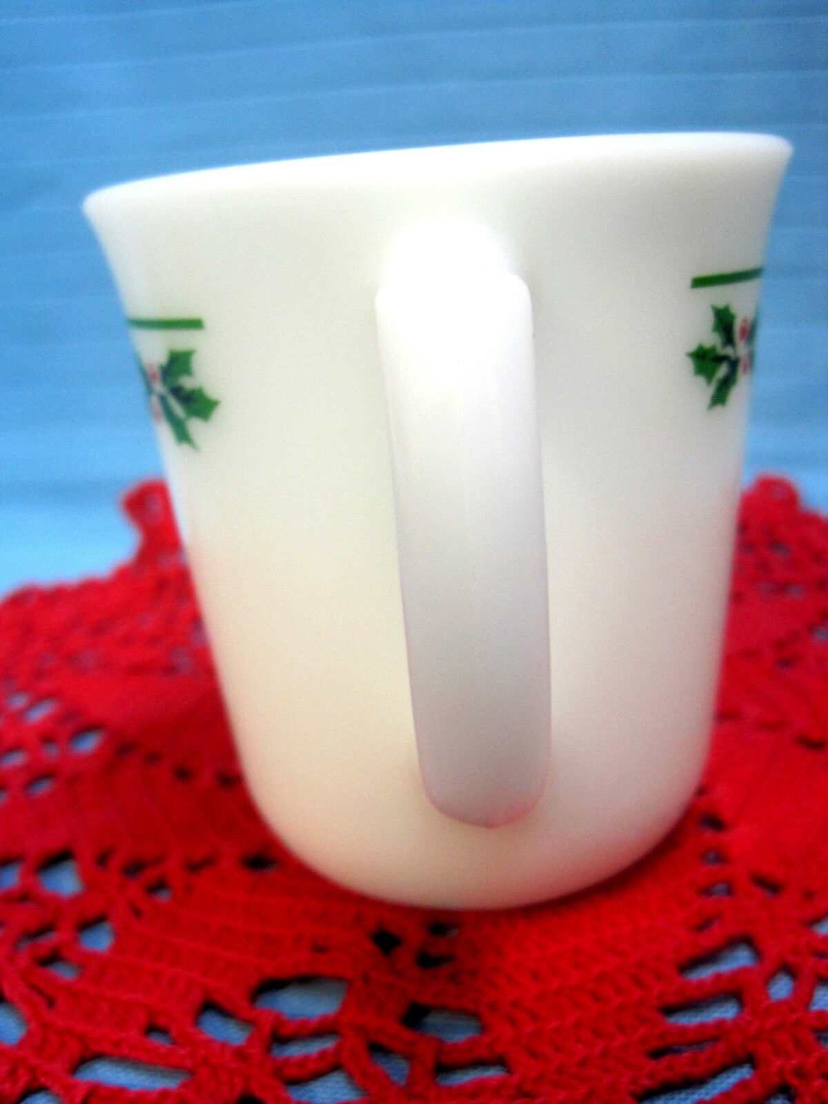 Corning Mug Cup Milk White Glass Christmas Holiday Design & Red Crochet Dollie