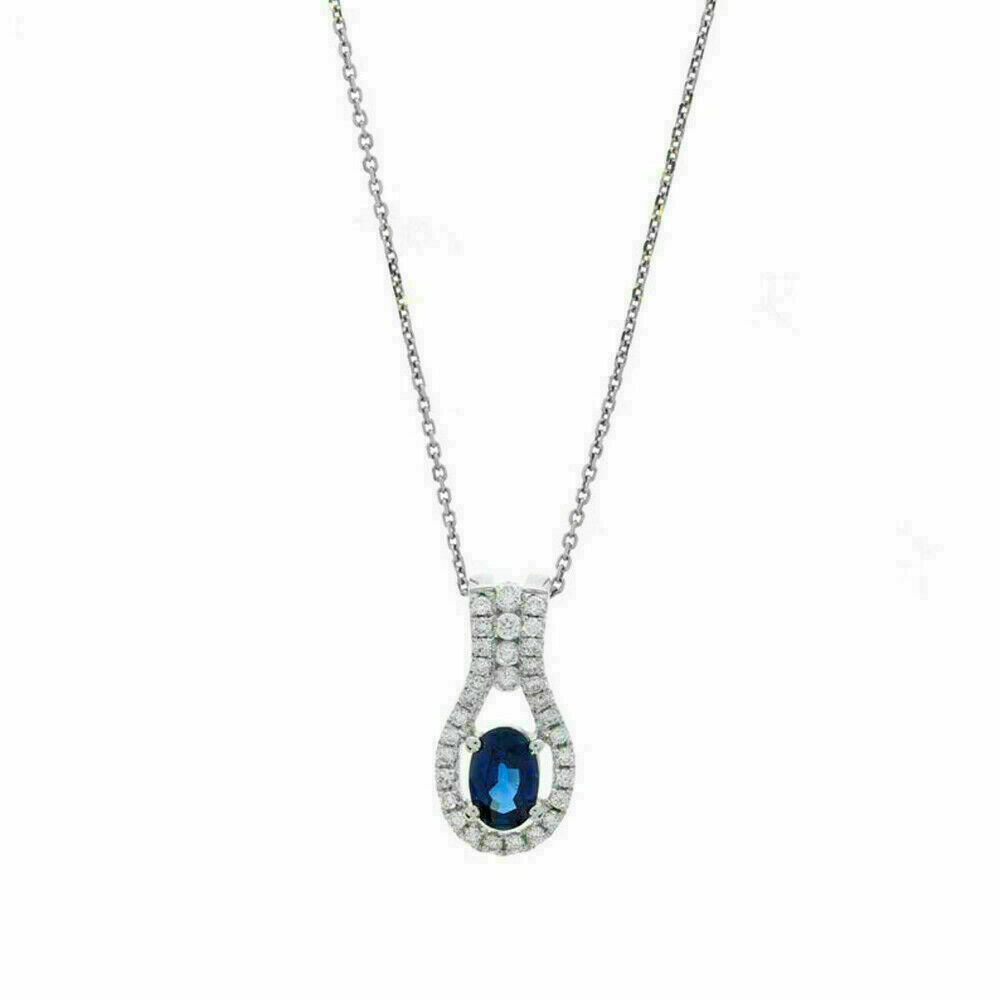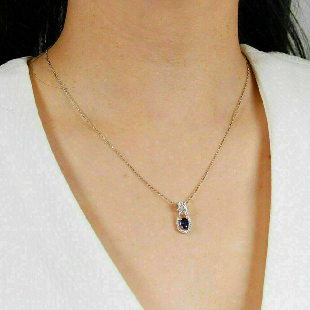 2.50Ct Coupe Ovale Bleu Saphir Halo Pendentif 14K or Blanc Finition 18 " Chaîne