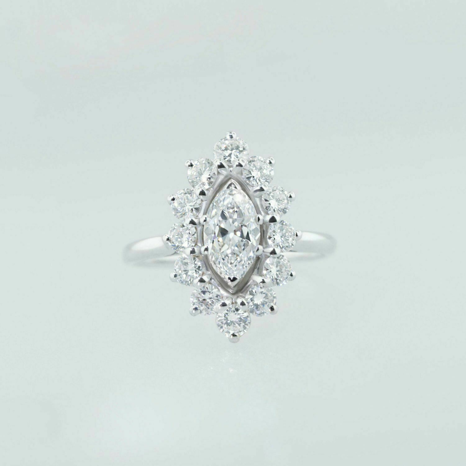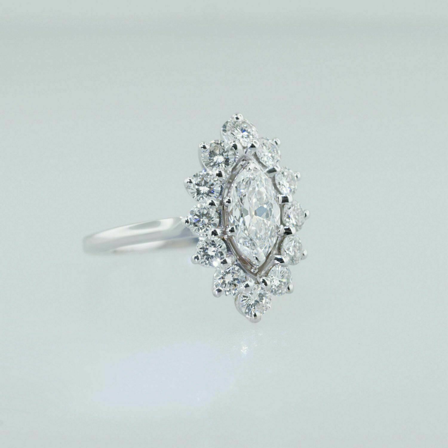 2Ct Corte Marquesa Diamante Redondo Grande Halo Compromiso Anillo 14k Oro Blanco