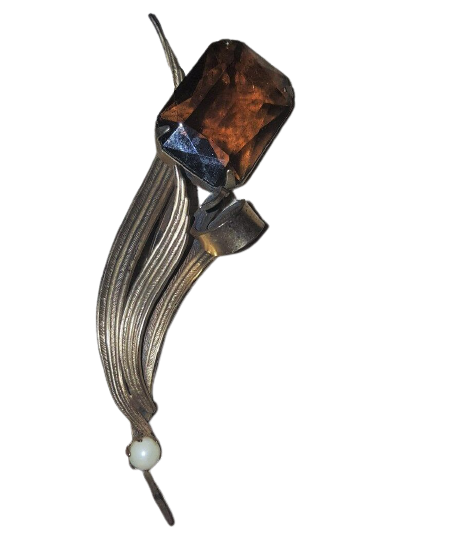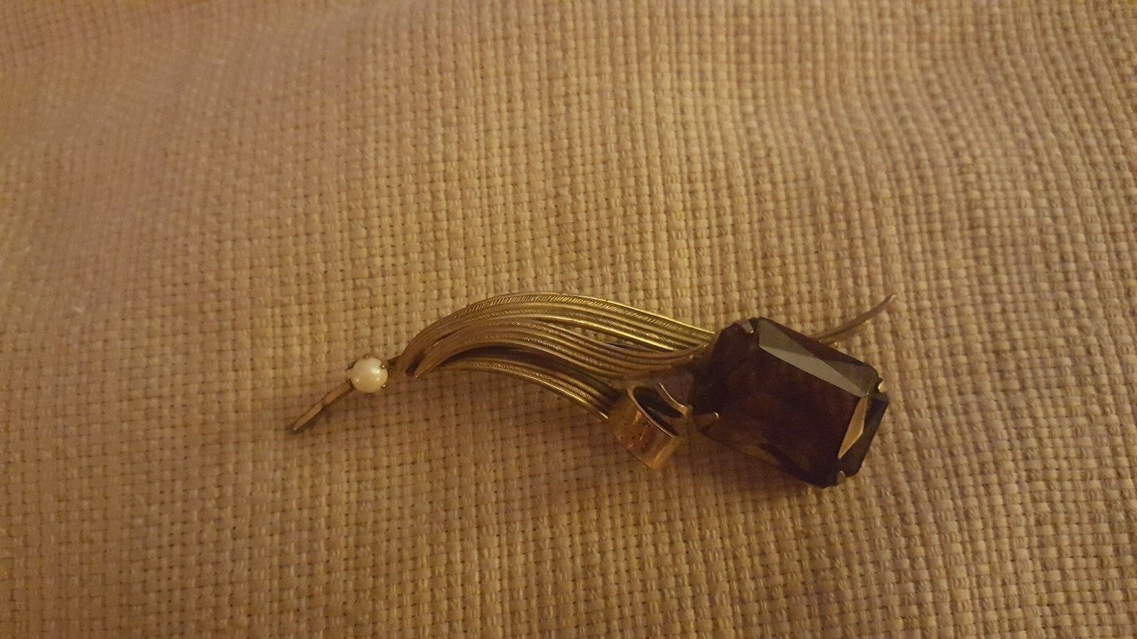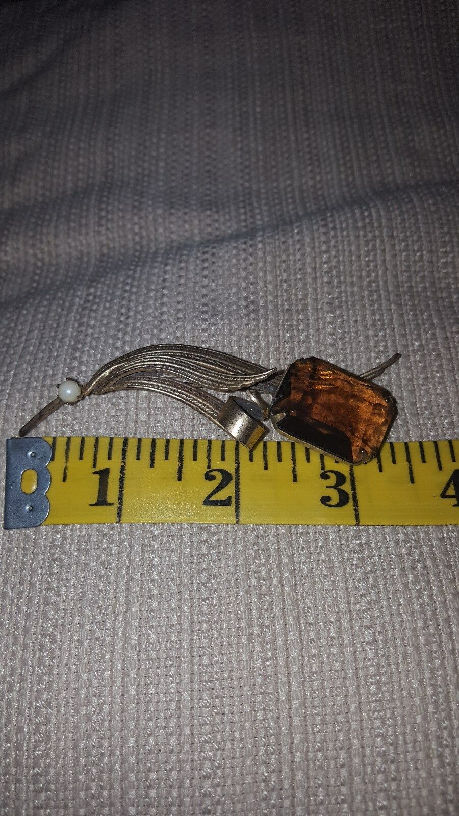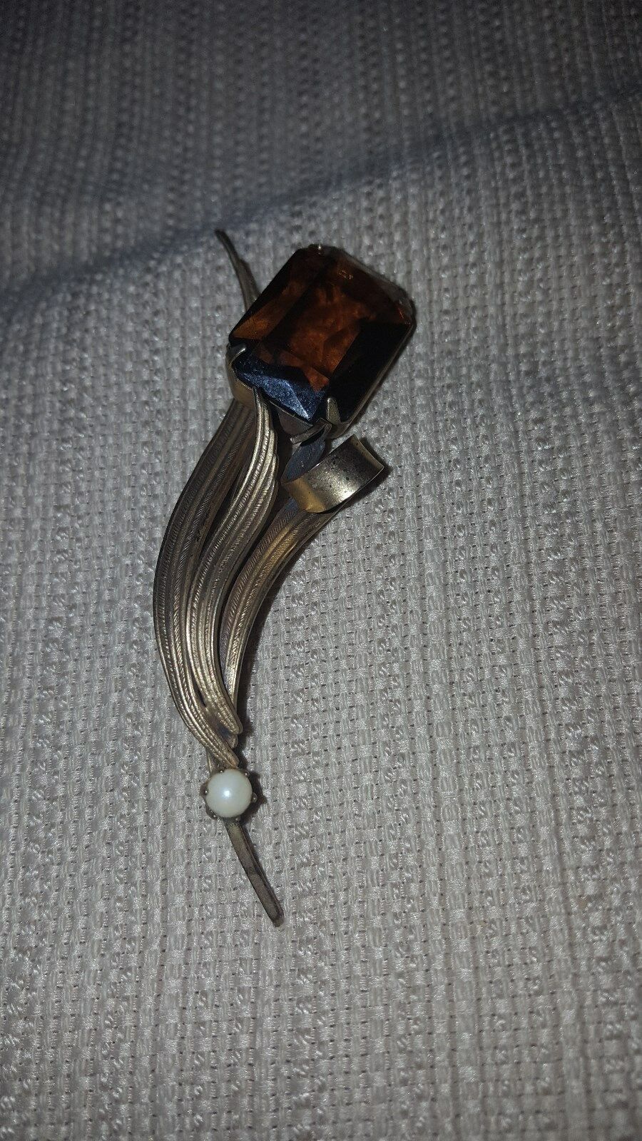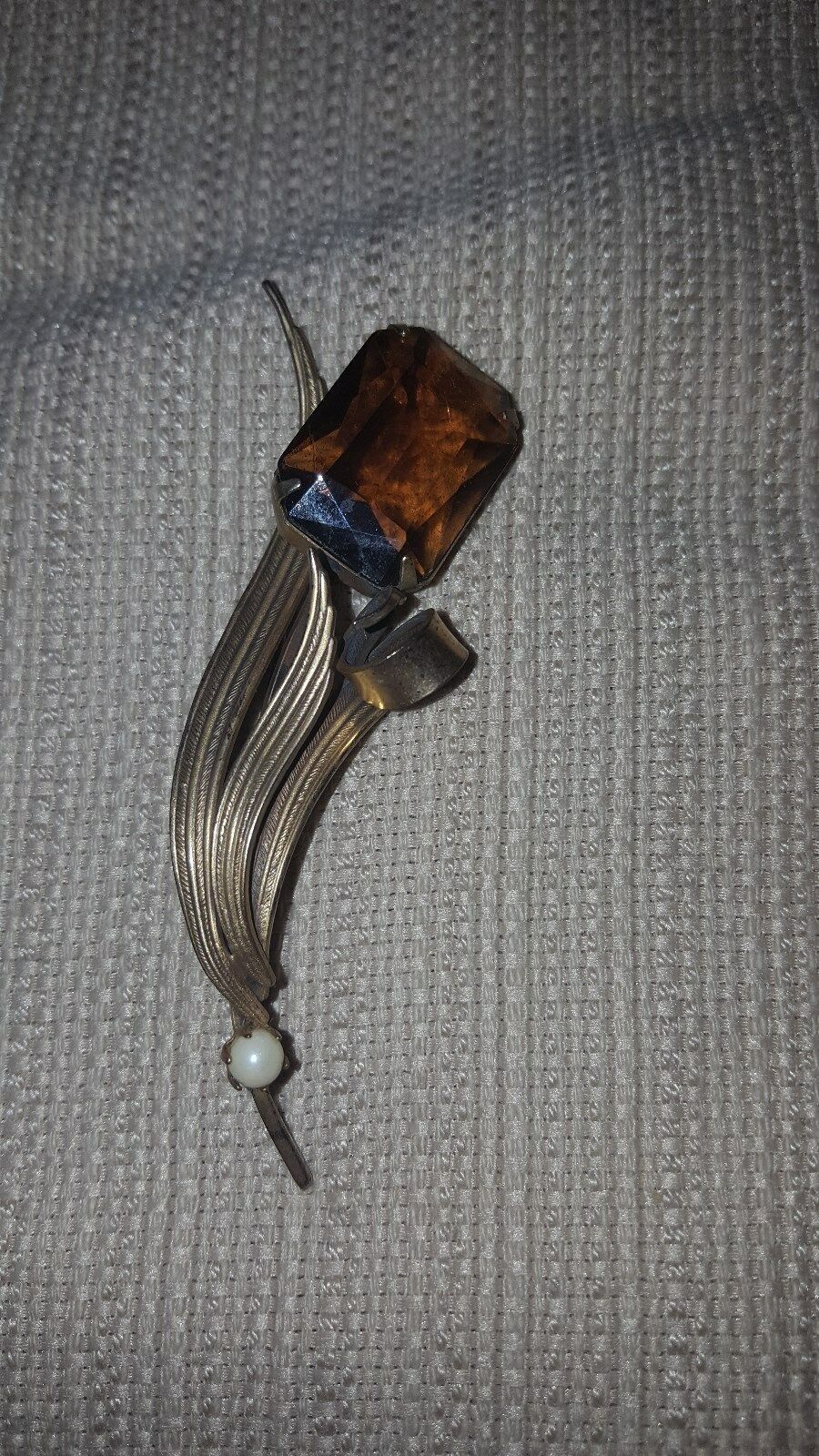 Vintage amber root beer glass stone & gold tone metal flower brooch pearl accent
