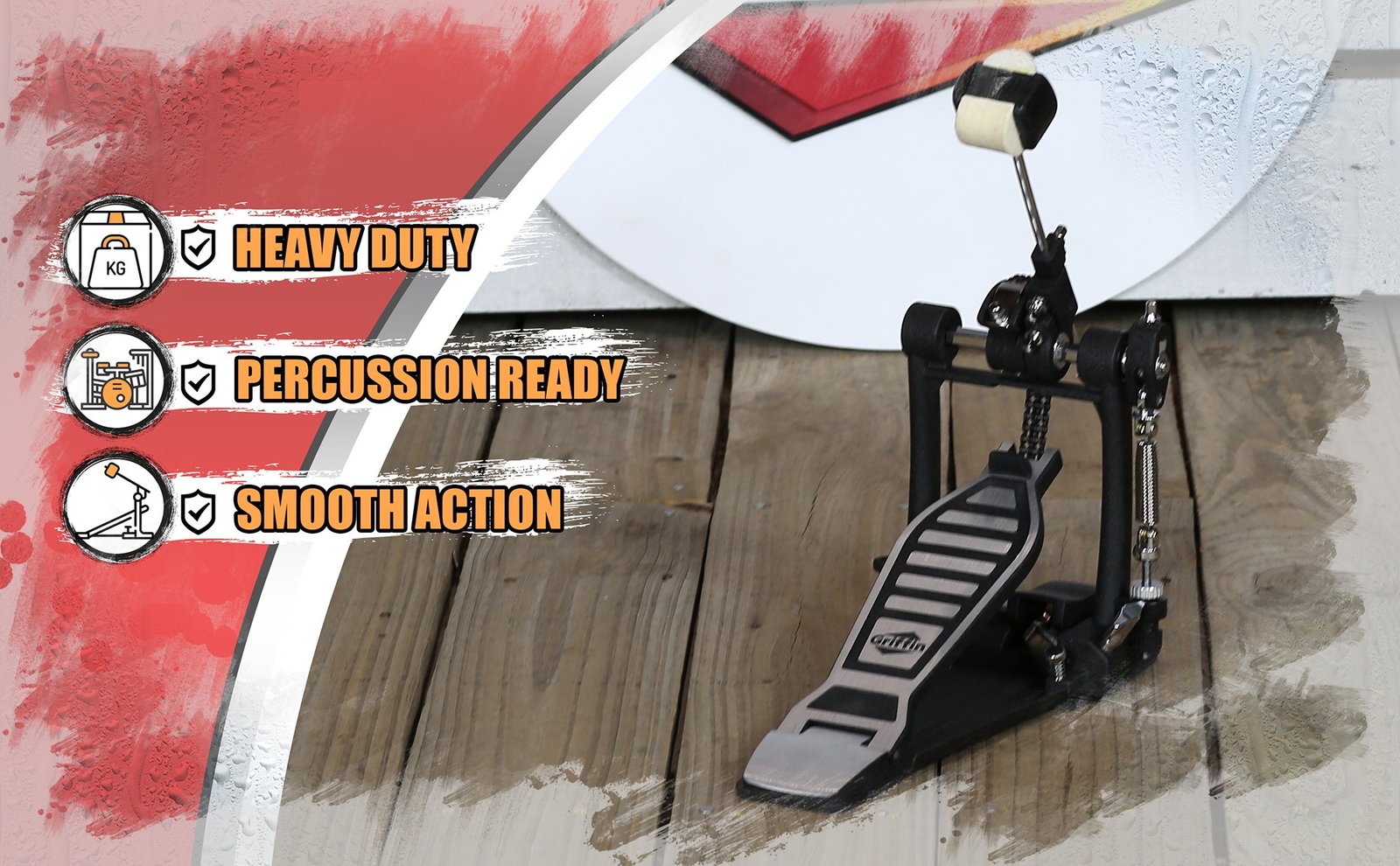 Single Kick Bass Drum Pedal by GRIFFIN | Deluxe Double Chain Foot Percussion Har