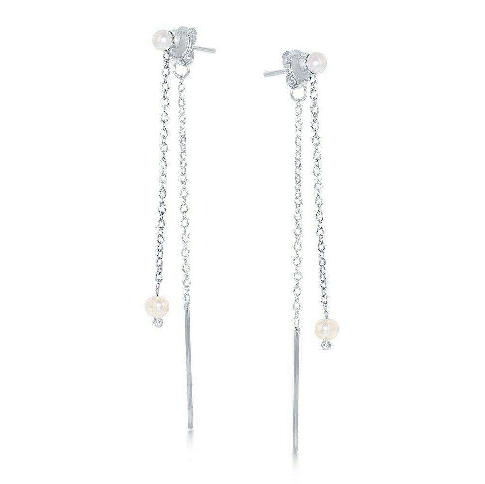 Front back post earrings; featuring a Fresh Water Pearl stud with dangling bar and round Fresh Water Pearl hanging from a delicate and shiny chain, making this glamourous stylish pair of earrings unique and chic among other earrings styles. Made of genuine 0.925 sterling silver, with a comfortable back post that you won't even feel while wearing them, don't miss this new trend for this ending summer; add them to your jewelry collection. More styles on our catalog, check them out, and choose the ones you most like; you will get in love with every pair of these stylish earrings.