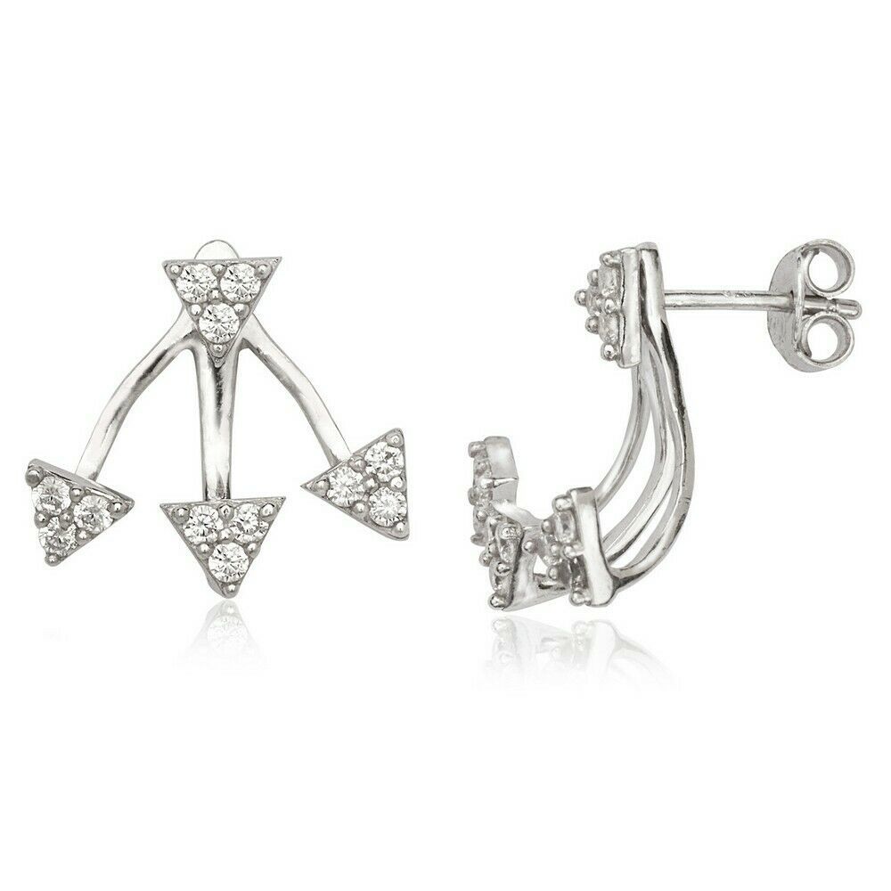 Front back post earrings; featuring a triangle CZ prongs stud and triple back triangles with clear cubic zirconia encrusted, making this modern designer pair of earrings unique and chic among other earrings styles. Made of genuine 0.925 sterling silver, with a comfortable back post that you won't even feel while wearing them, don't miss this new trend for this ending summer; add them to your jewelry collection. More styles on our catalog, check them out, and choose the ones you most like; you will get in love with every pair of these stylish front-back earrings.