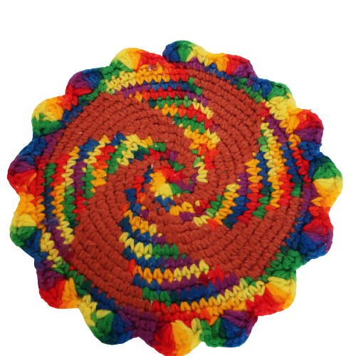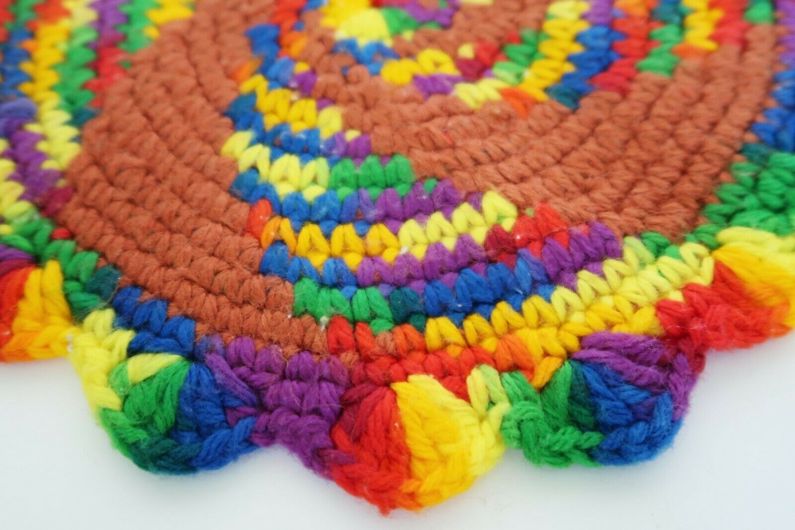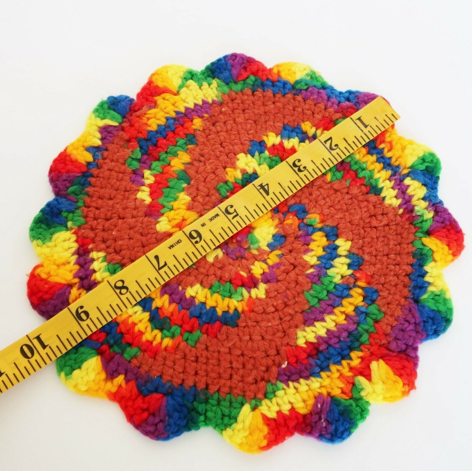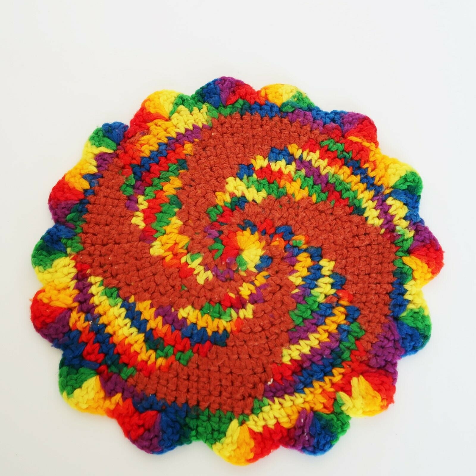 Vintage kitschy handmade knitted crocheted multicolor rainbow potholder trivet