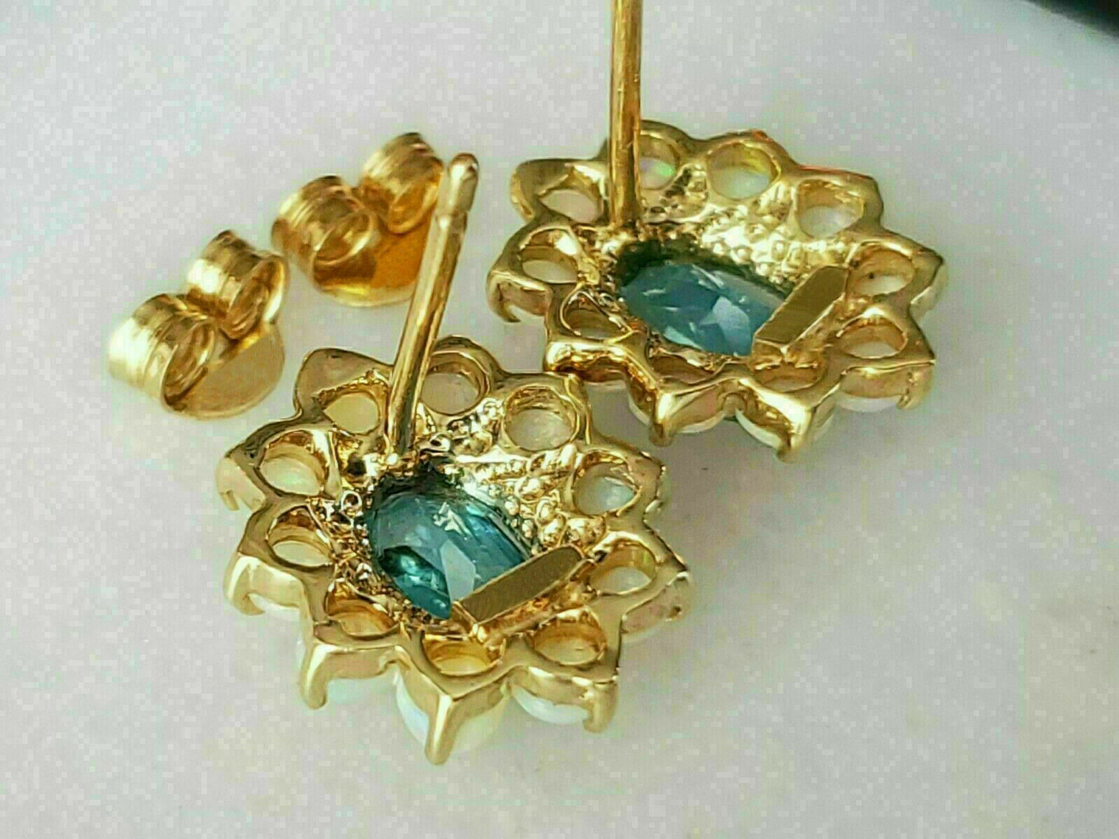 4Ct Ovalado Corte Topacio Azul Fuego Ópalo Halo Dormilonas 14k Oro Amarillo