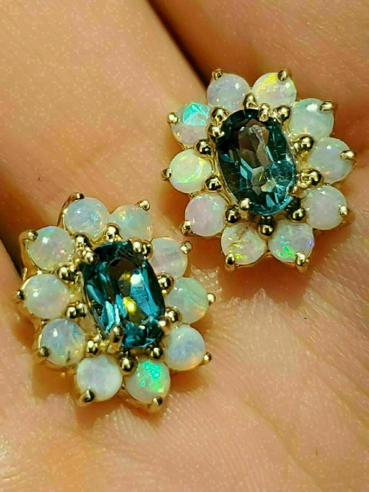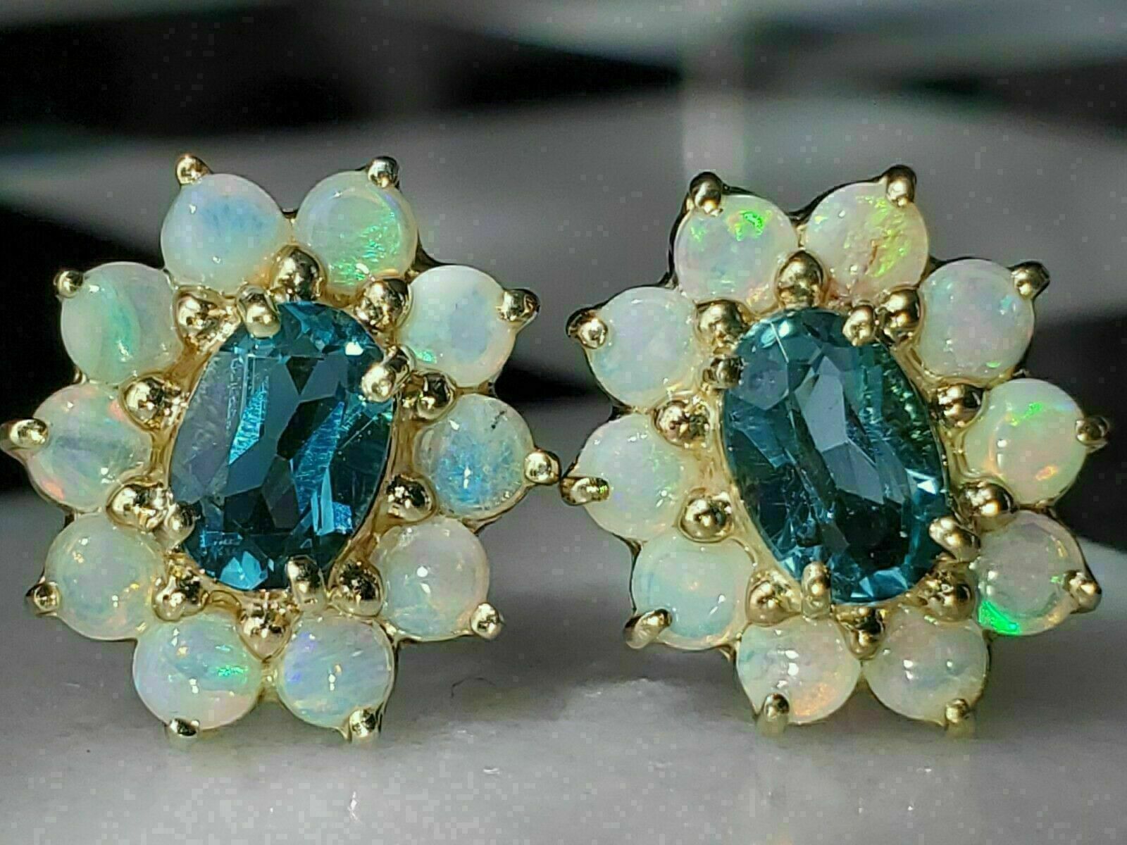 4Ct Ovalado Corte Topacio Azul & Fuego Ópalo Halo Dormilonas 14k Oro Amarillo