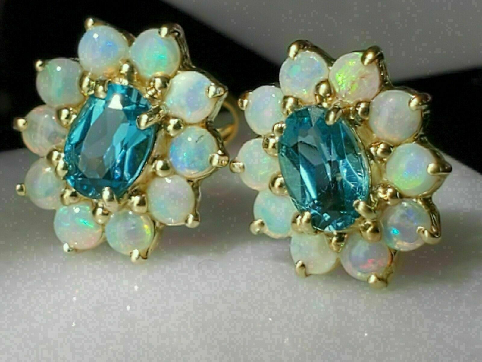 4Ct Oval Schliff Blau Topas & Feuer Opal Halo Ohrstecker 14k Gelbgold Über