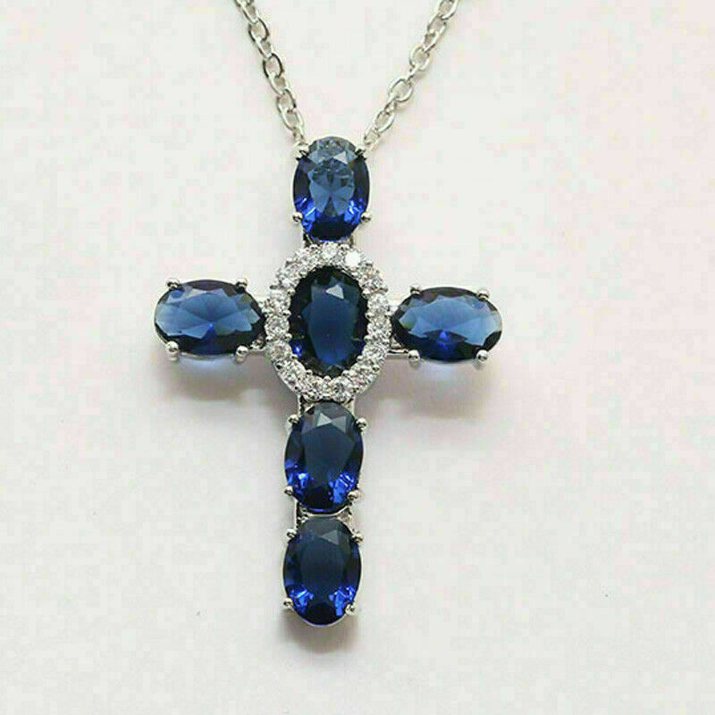 Halloween SPECIAL-3Ct Corte Ovalado Zafiro Azul Colgante de Cruz 14K Oro Blanco