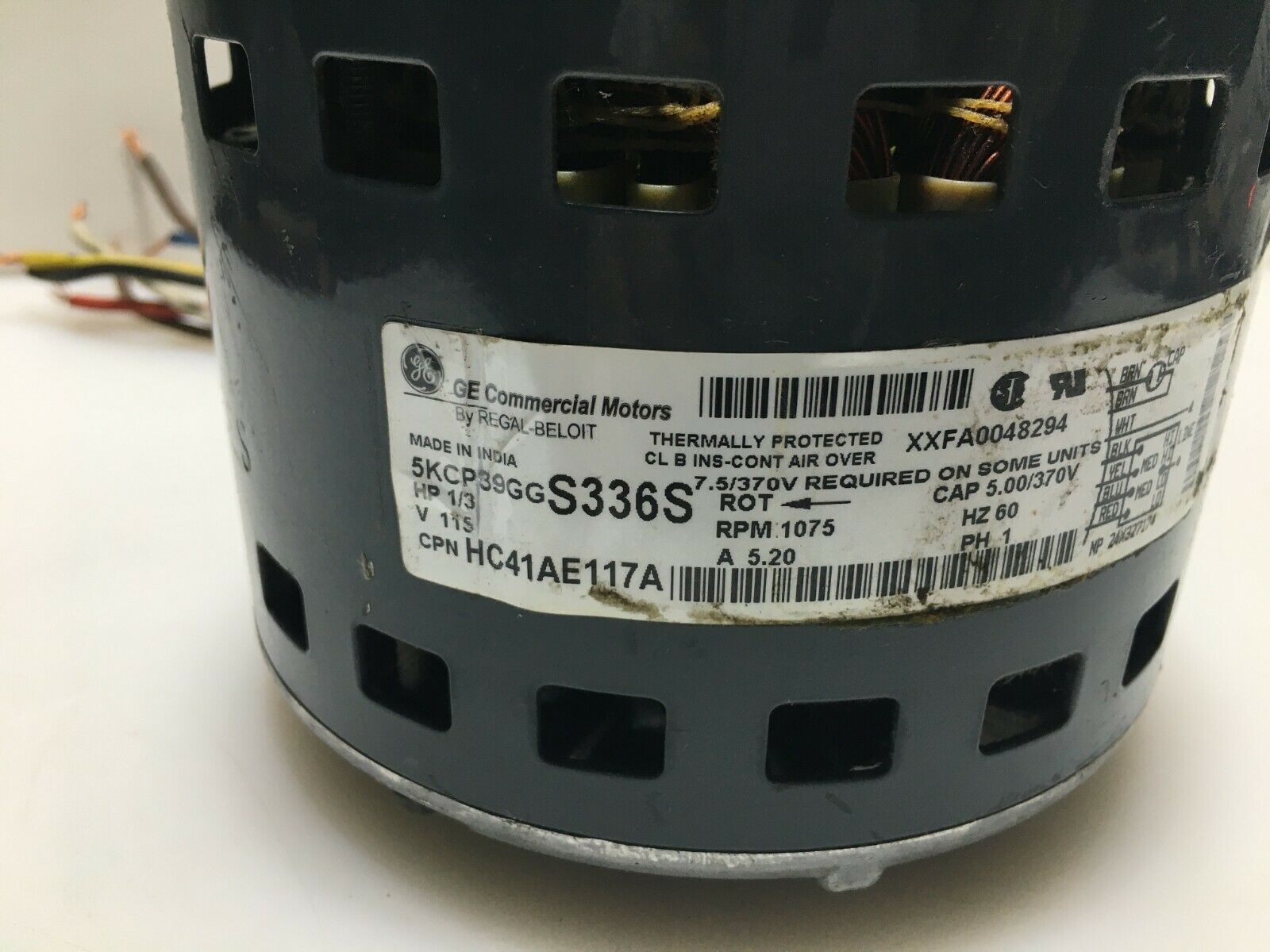 This is GE 5KCP39GGS336S Blower Motor 1/3HP 1075RPM 1PH 115V HC41AE117A used part.