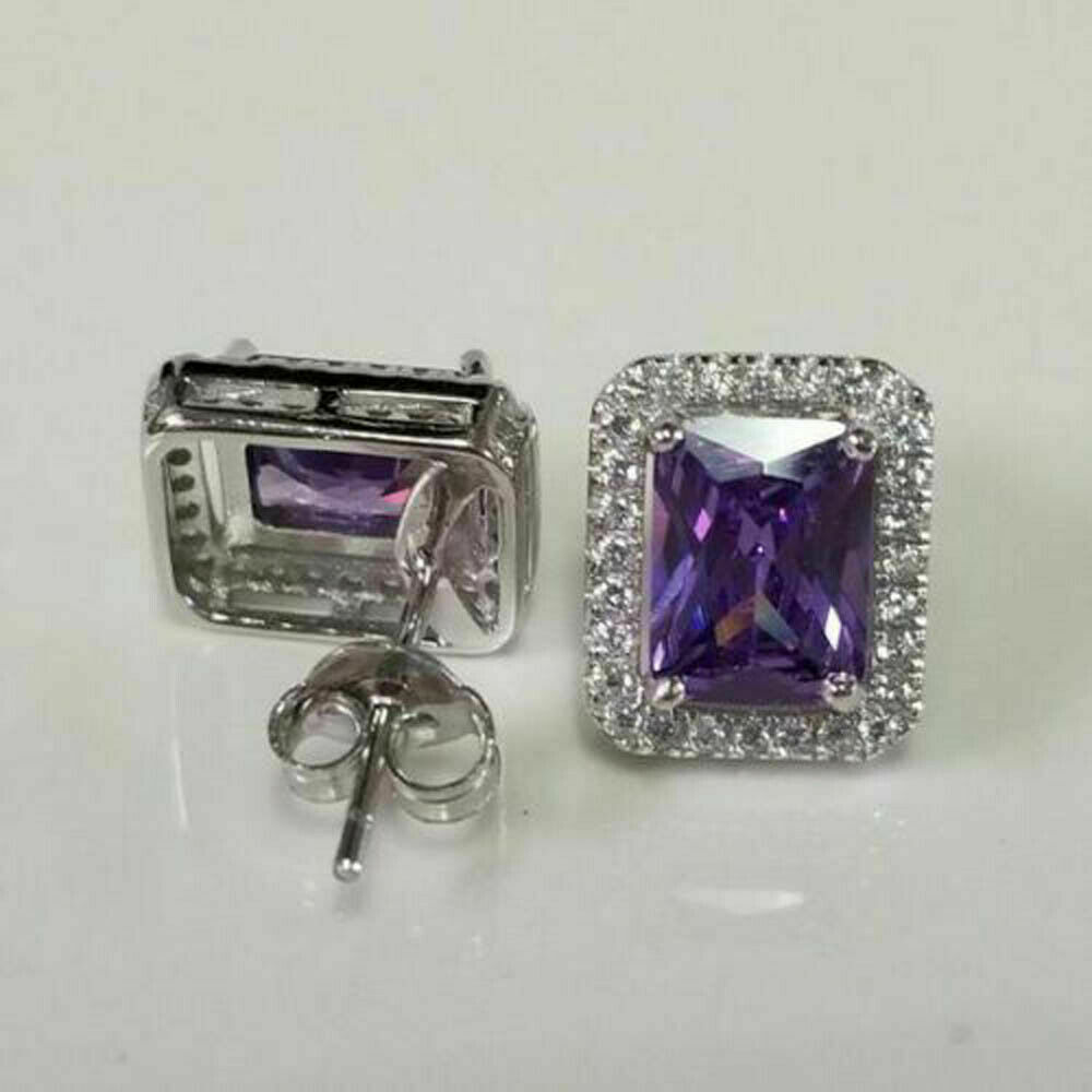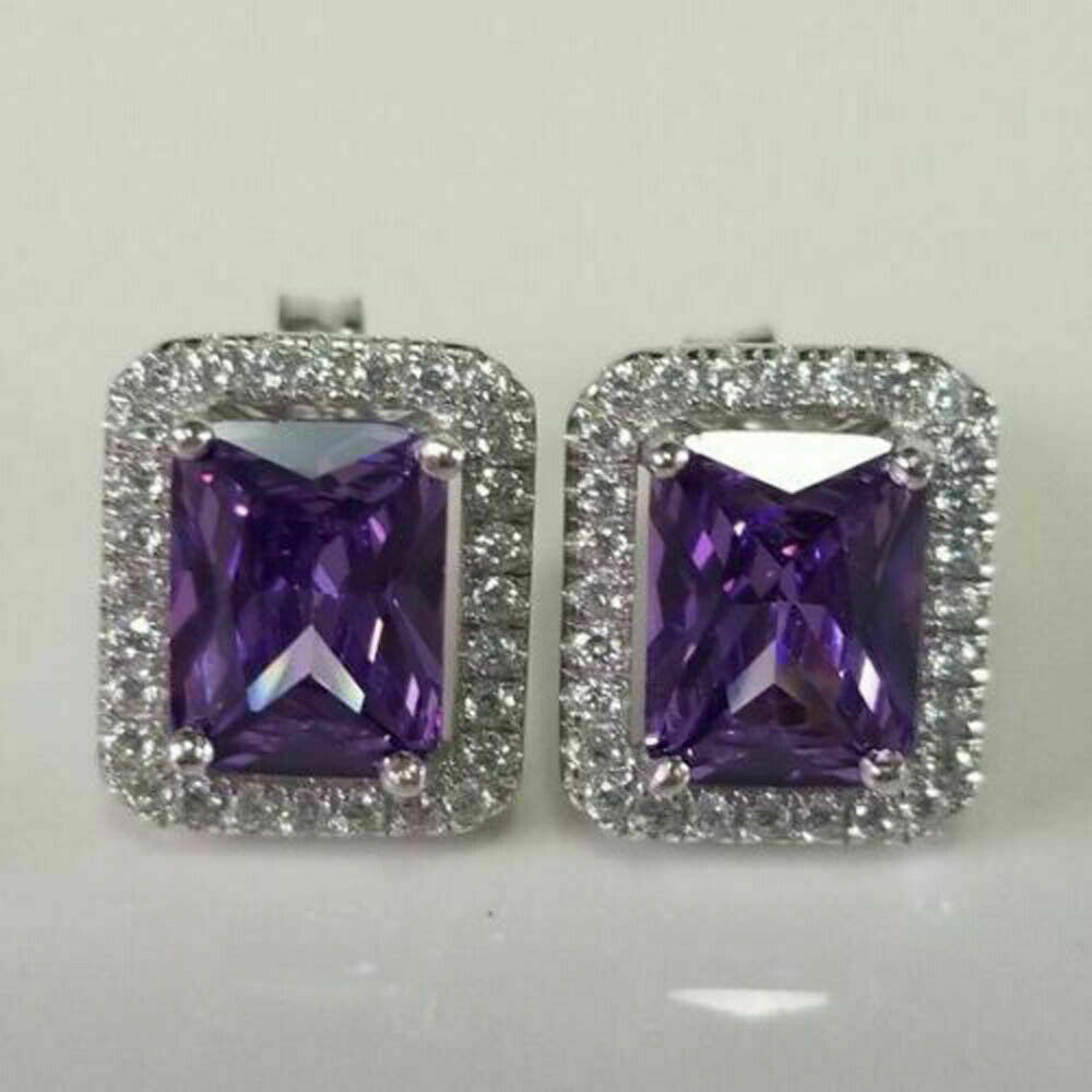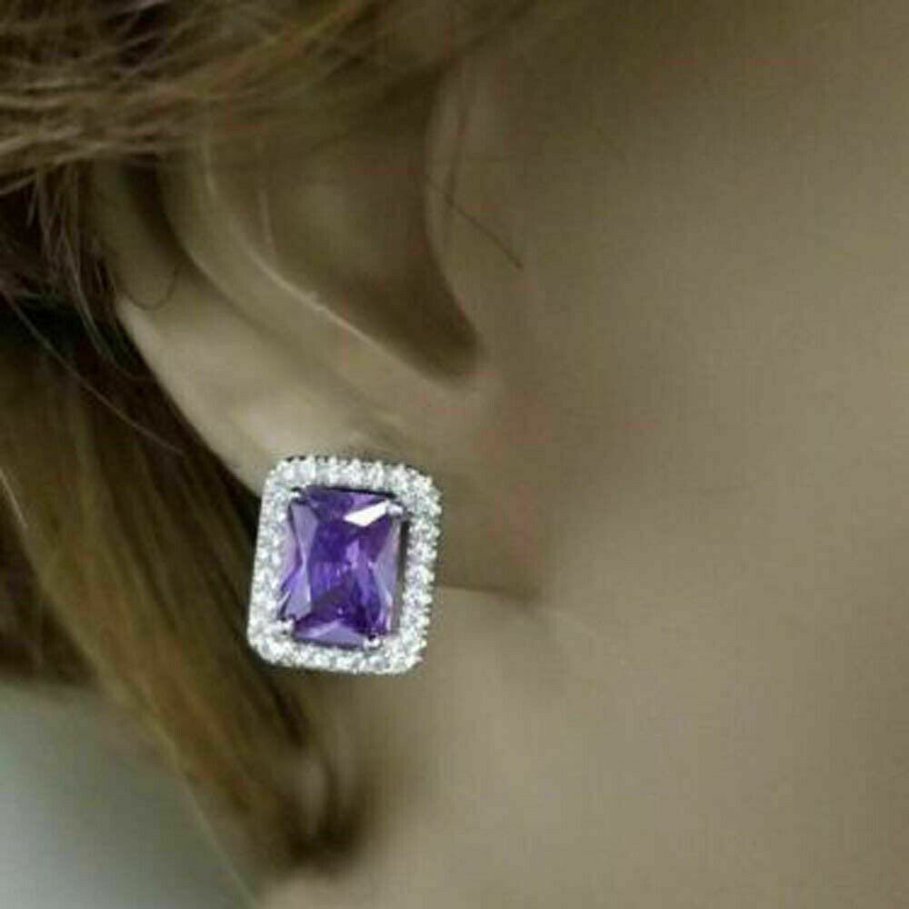3Ct Smeraldo Taglio Ametista Viola Diamante Halo Orecchini a Lobo 14K Oro Bianco
