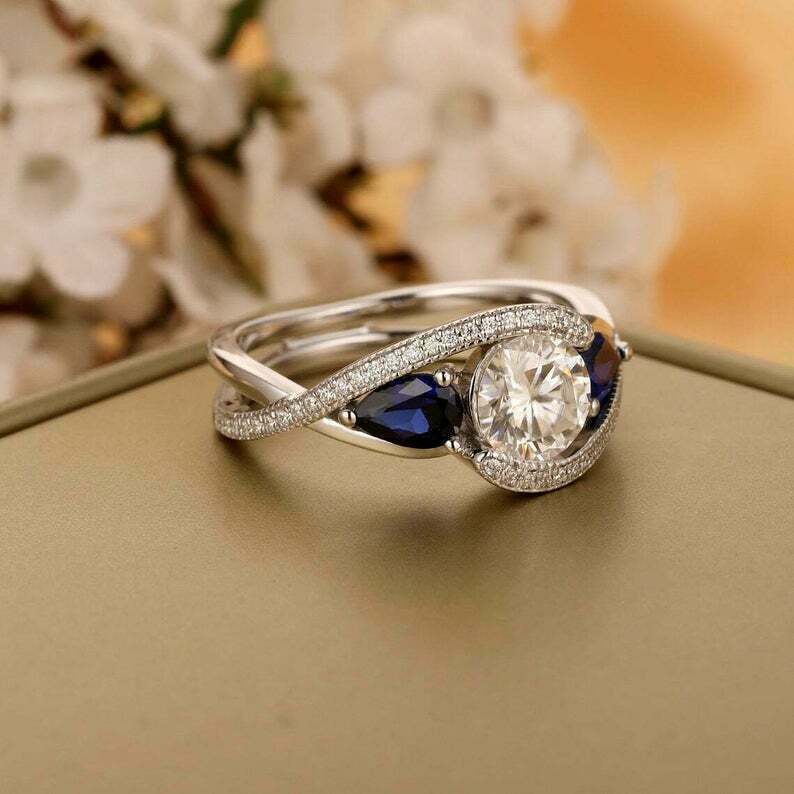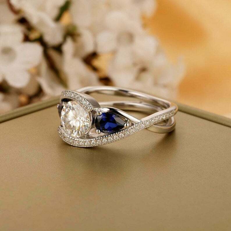 3Ct Taglio Rotondo Diamante & Zaffiro Contorto Fidanzamento Anello 14k Oro
