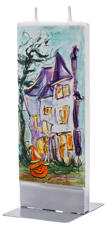 Flatyz Handmade Twin Wick Unscented Thin Flat Candle - Haunted House With Jack-O