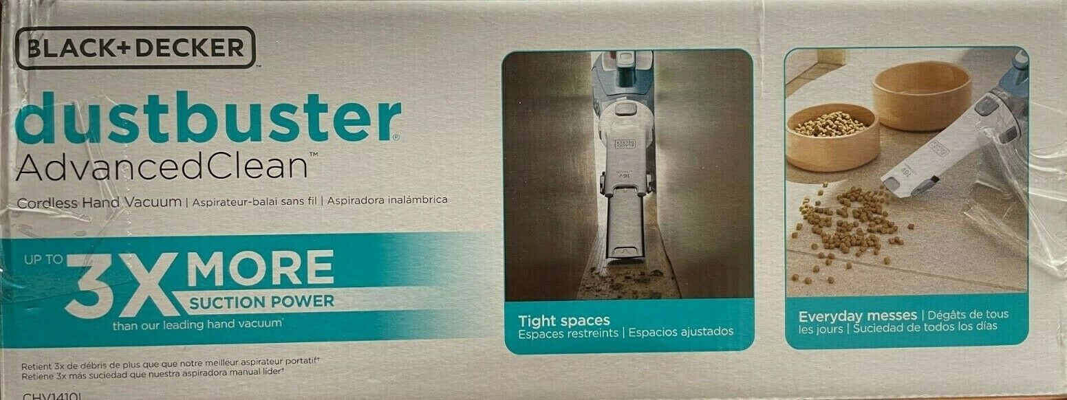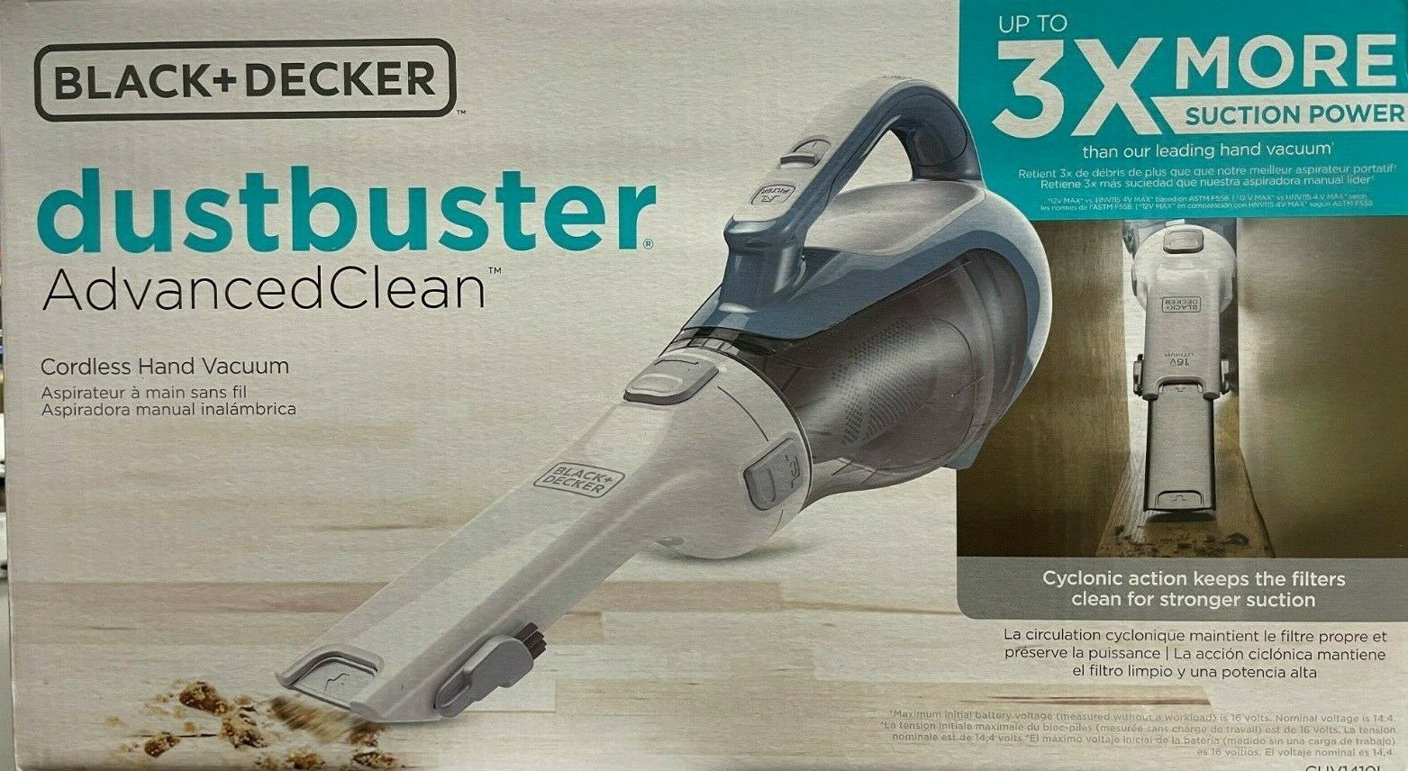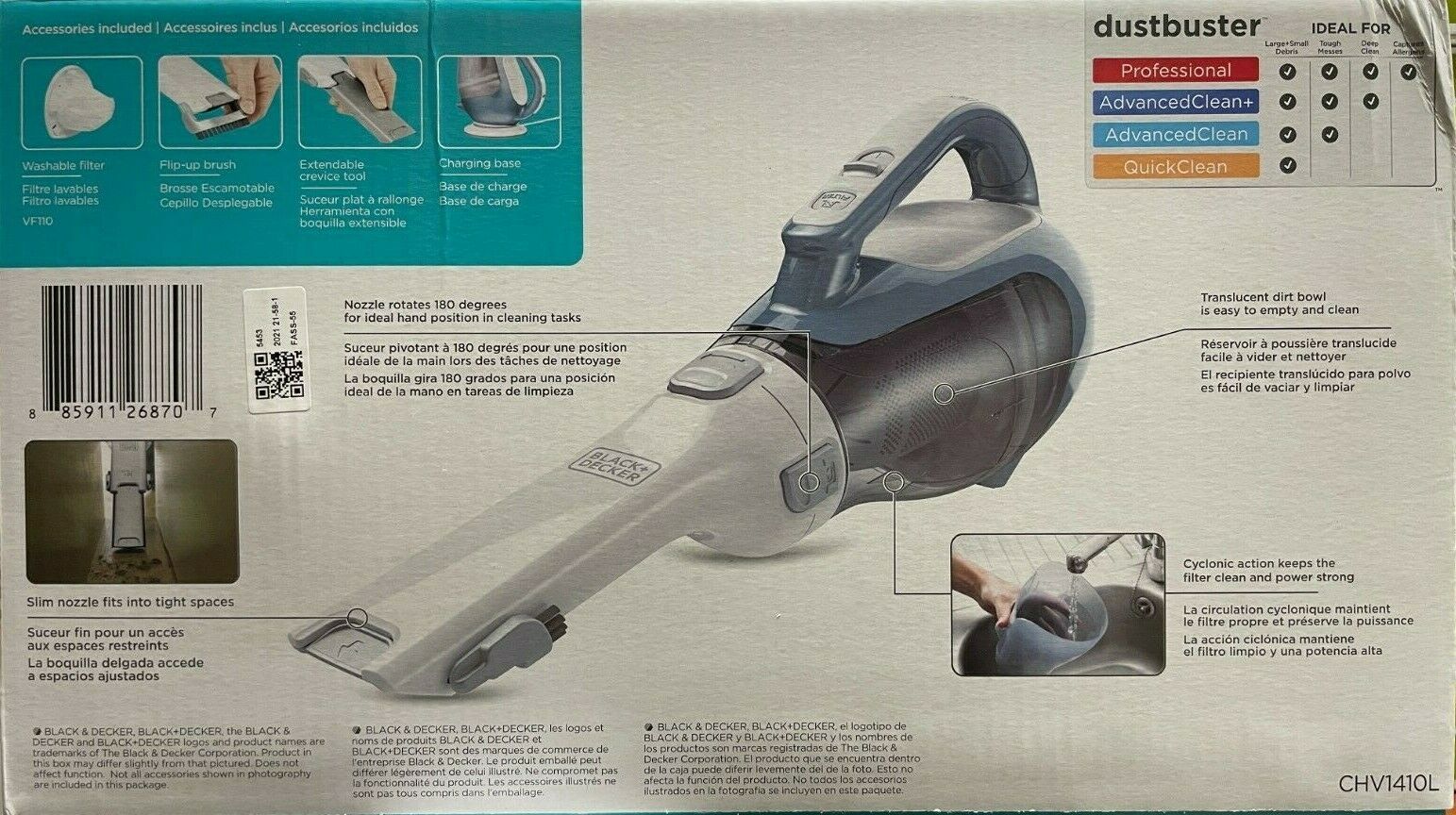 Black Decker Dustbuster - BLUE - 14.4V Cordless Lithium Ion Hand Vac allows for quick and easy cleanup, with a battery that lasts longer year over year. Its lightweight design allows for maximum portability. It features 50-percent more reach than the previous dustbuster design. This DustBuster is always ready as it holds a charge for up to 18 months and charges up to 5X faster (vs CHV1410). Cyclonic action helps to keep the filter clean and power strong. It has a rotating slim nozzle for a variety of applications and removable, washable bowl and filters for thorough cleaning. Translucent bagless dirt bowl makes it easy to see and empty dirt. Brush and crevice tool accessories are located on-board so there are no loose items to misplace.